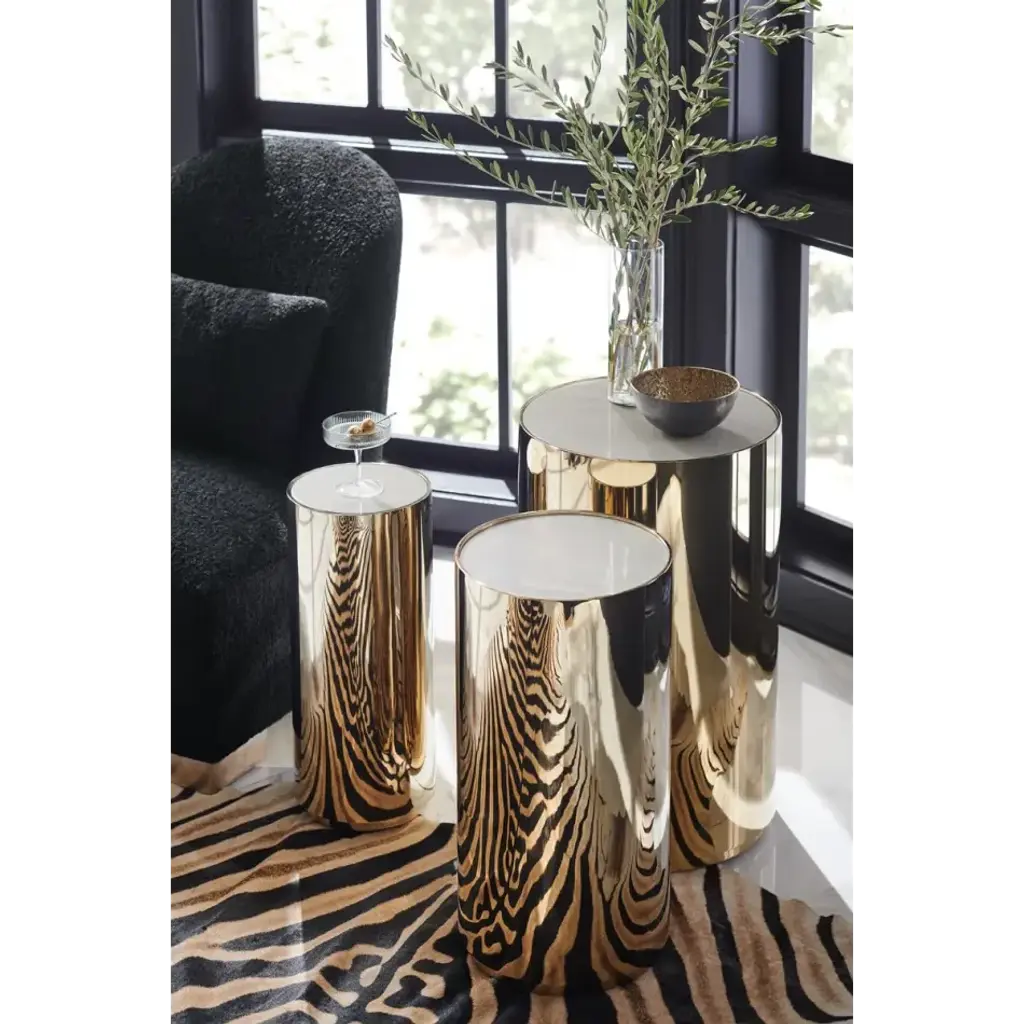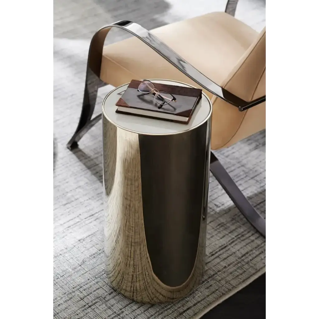 With a bold, yet simple shape, this modern accent table uses pure form and minimal materials to draw attention. The perfect pedestal for a beverage or vase, its sturdy stainless steel base is topped in our Signature Caracole Crème stone, and finished in a Whisper of Gold for added luxury and moments of reflection. Style solo, or group with our Round About short and tall tables in varying heights and diameters to create added interest and dimension.