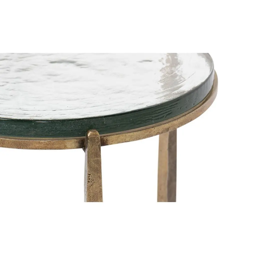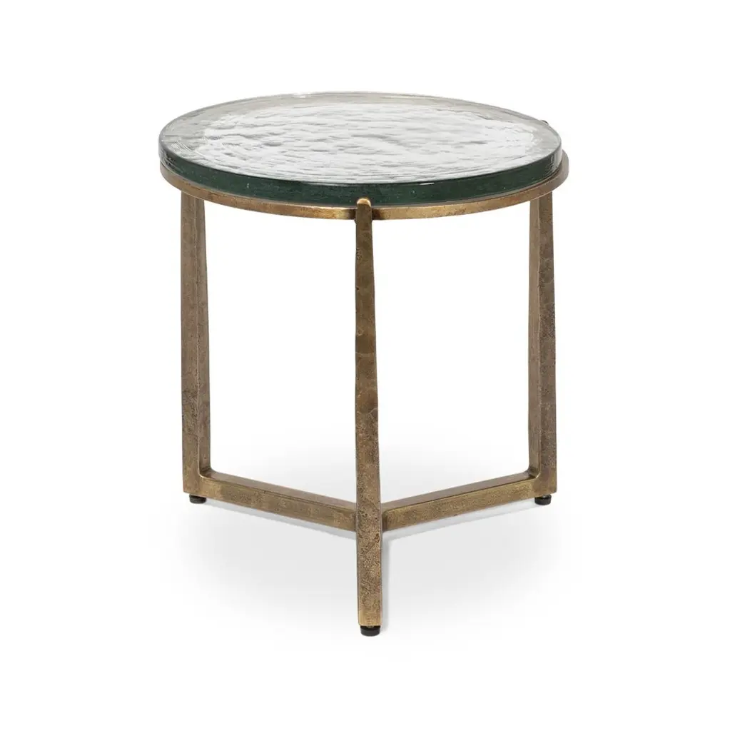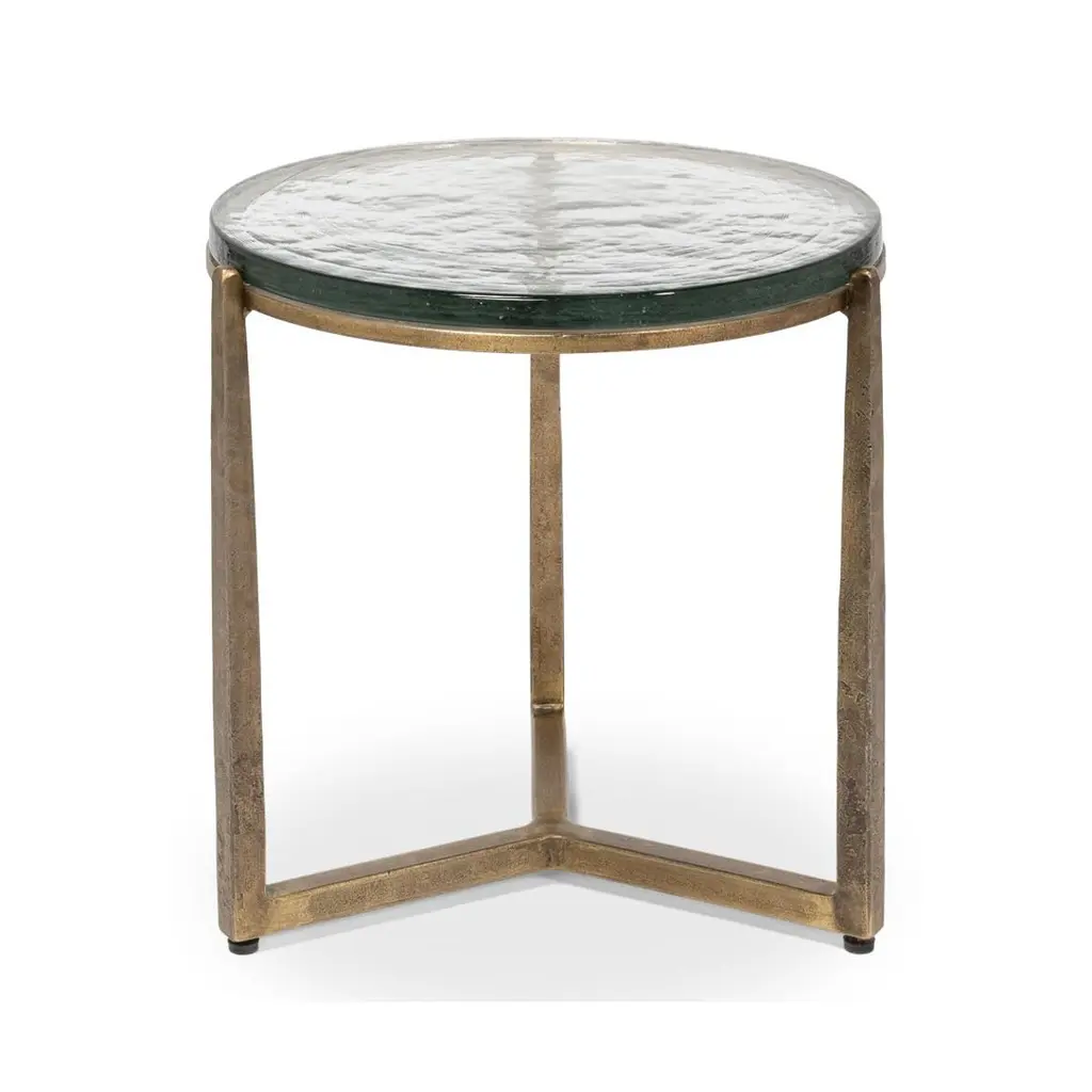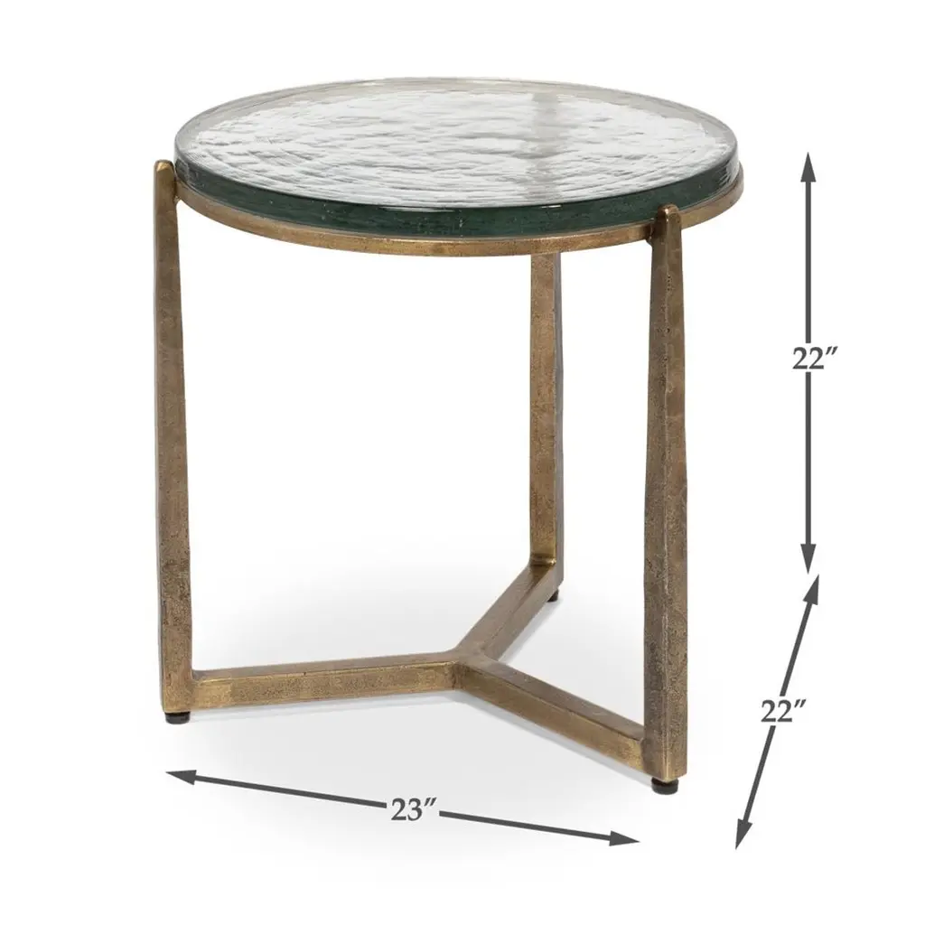 This exquisite piece features a hand-forged iron base in an aged brass finish, lending a touch of vintage elegance while maintaining a sleek contemporary aesthetic. The casted glass top, with its organic texture, adds depth and character, reflecting light beautifully to enhance any interior.Perfect as a statement accent beside a sofa or as a sophisticated complement to your favorite reading nook, this end table offers a harmonious balance of durability and artistry. Its compact design makes it an ideal addition to both spacious and intimate settings, effortlessly elevating the ambiance of any room.Dimensions: 23" W x 22" D x 22" H