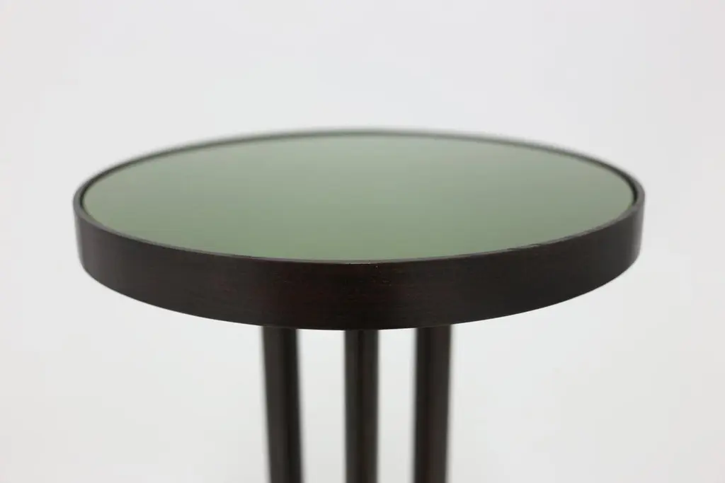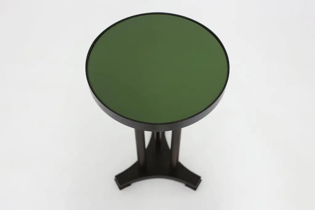 Round End Table With Painted Olive Green Glass Top And Dark Mahogany Base