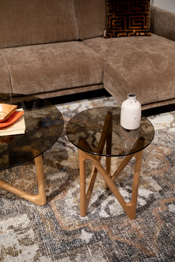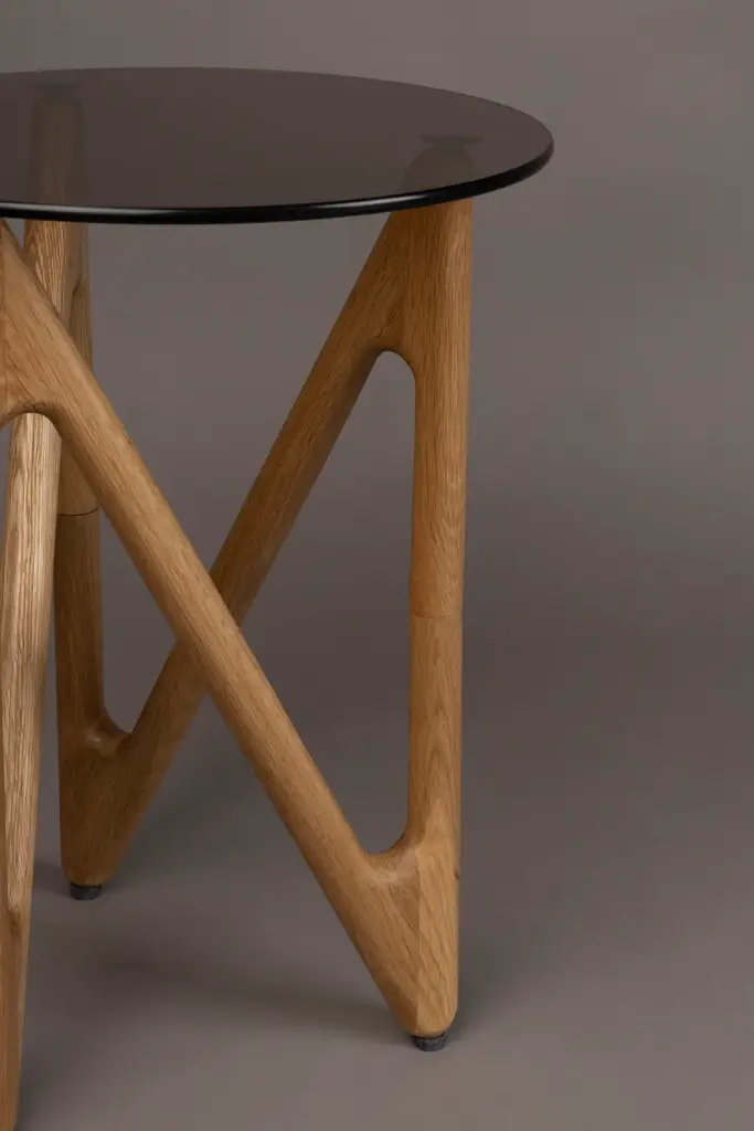 If you are looking for a special piece of furniture to give the seating area more character, the Dutchbone Naia is the right place for you. This side table is inspired by the undulating movement of the sea. This is clearly reflected in the organic shapes of the base. The oak wood with natural or walnut-colored stain also gives off a lot of heat. In combination with the round, glass table top, this creates an attractive and slightly retro look, which would not look out of place in a seventies interior. Perfect for creating an intimate setting to gather with friends or family – a place to warm your soul.