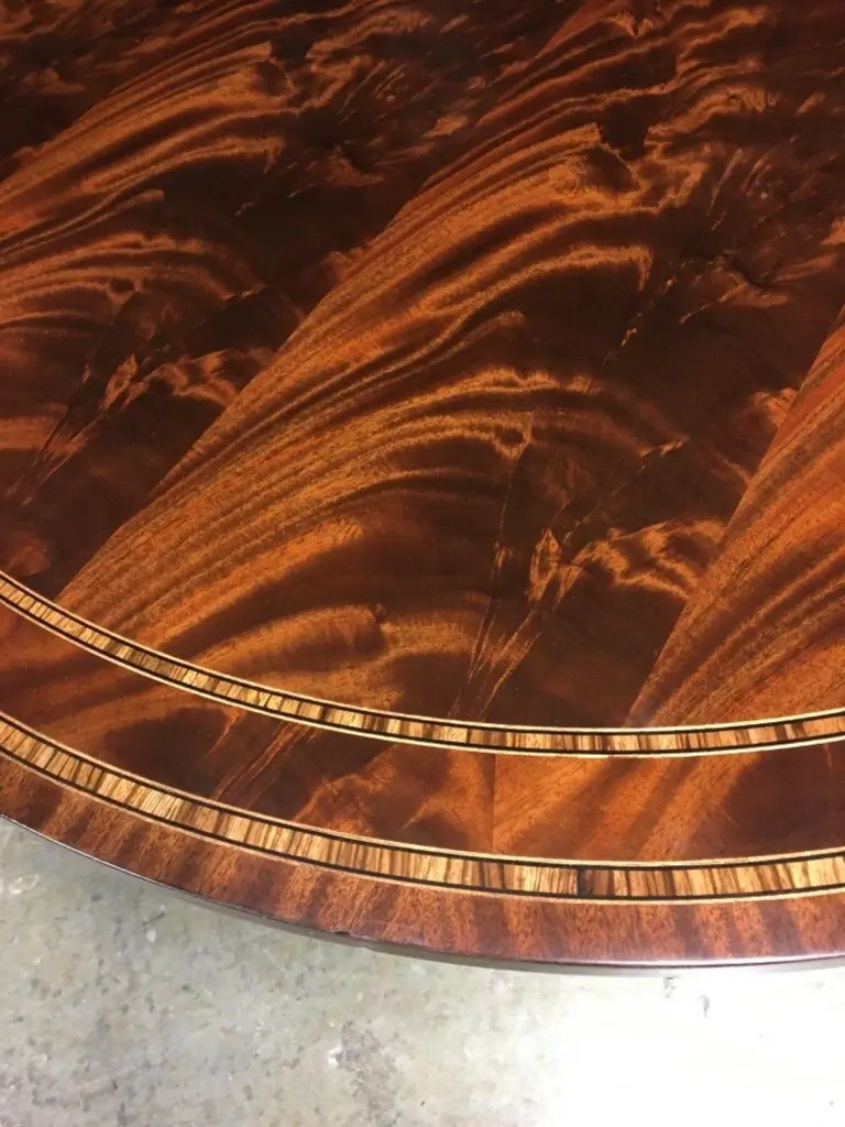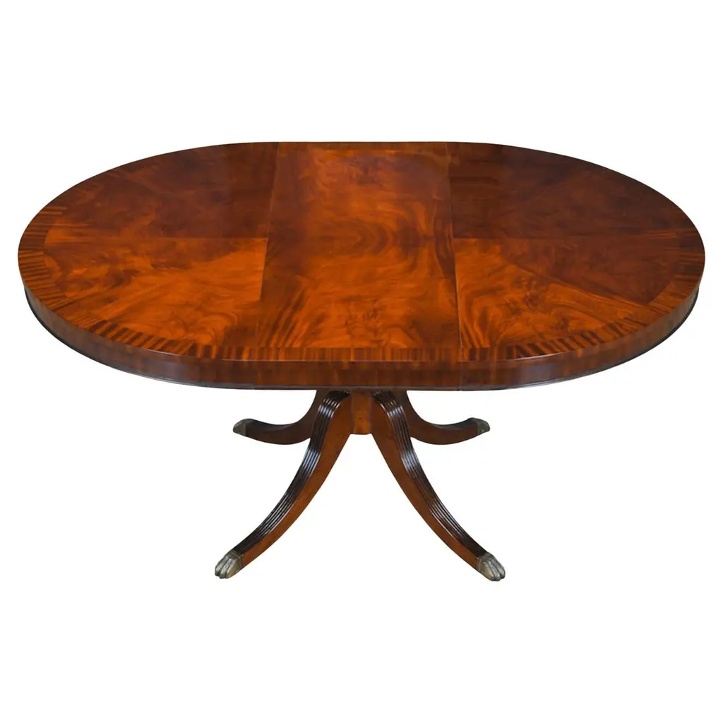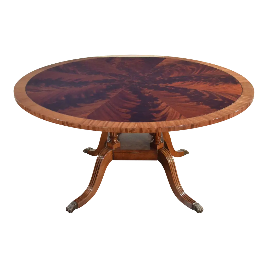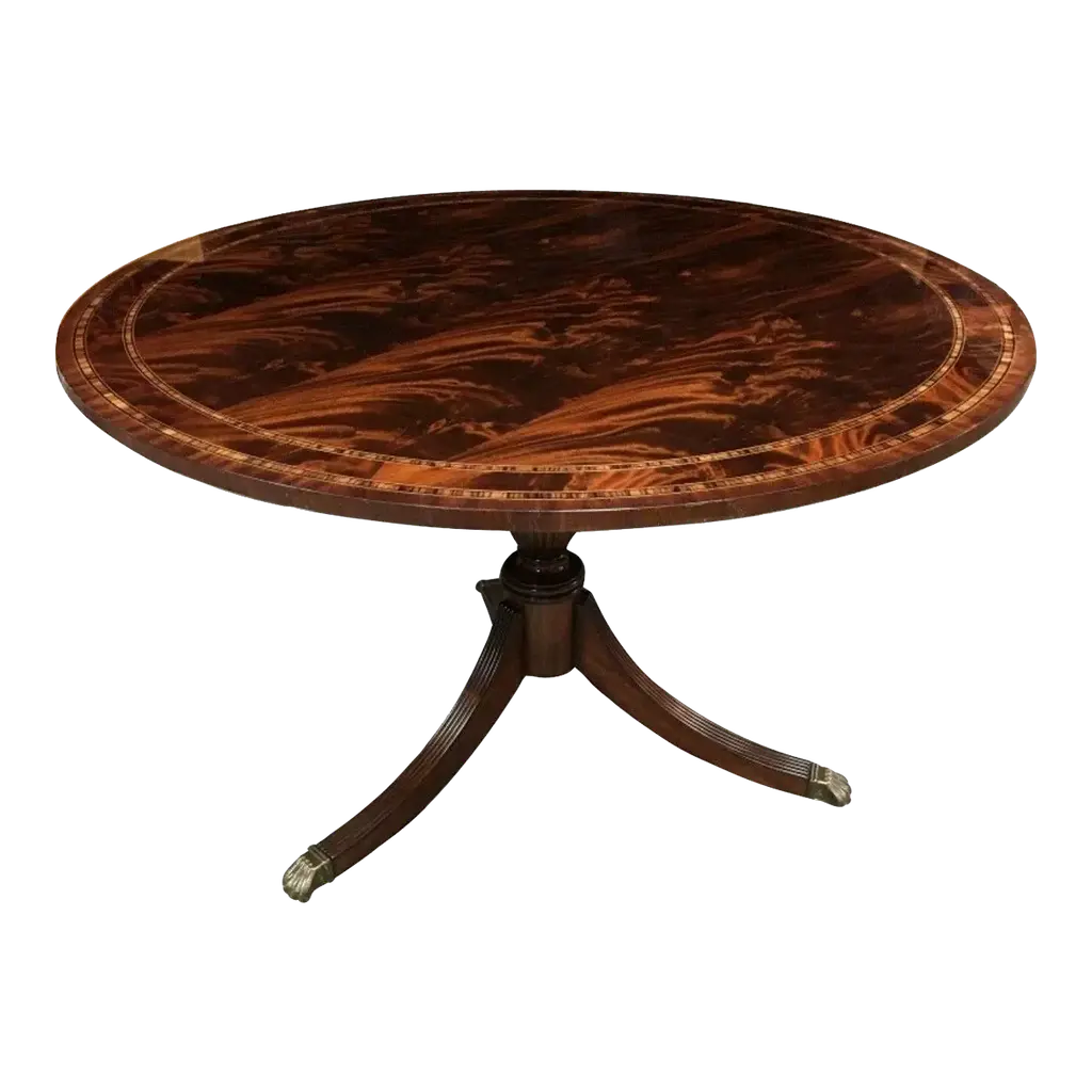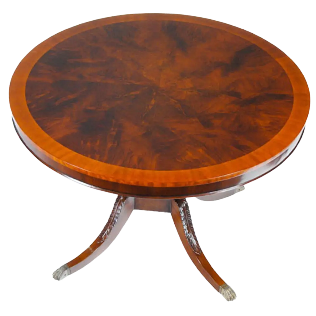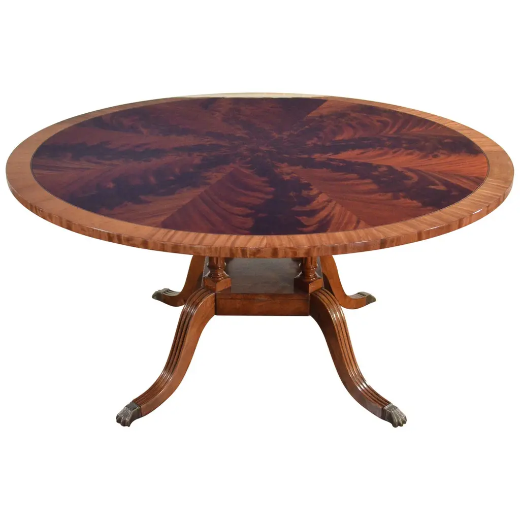 This is a made-to-order round traditional mahogany accent/foyer table made in the Leighton Hall shop. It features a field of crotch mahogany and borders of crotch mahogany and straight grain mahogany with inlays of Zebra wood. It has a hand rubbed and polished semigloss finish. The pedestal has three fluted legs which terminate with antique brass lions paw feet. Dimensions: 42 in. diameter, 30 in. high.Available as shown (42 in. Diameter) or 48 in. (subject to raw materials availability). Other options available. Options may affect price and manufacturing time.