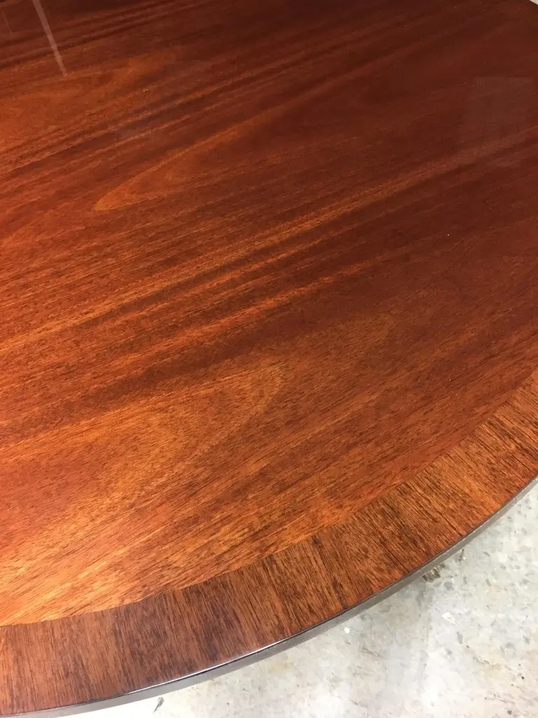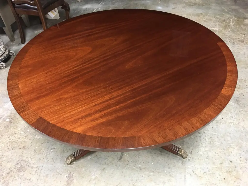 This is made-to-order round traditional mahogany accent/foyer table made in the Leighton Hall shop. It features a field of cathedral mahogany and a border of straight grain mahogany. It has a hand rubbed and polished semigloss finish. The pedestal has three fluted legs which terminate with antique brass lions paw feet. Dimensions: 48 in. diameter, 30 in. high. This table can be purchased as shown (48 in. diameter), or it can be made in other sizes: 42 in., 54 in. and other.
