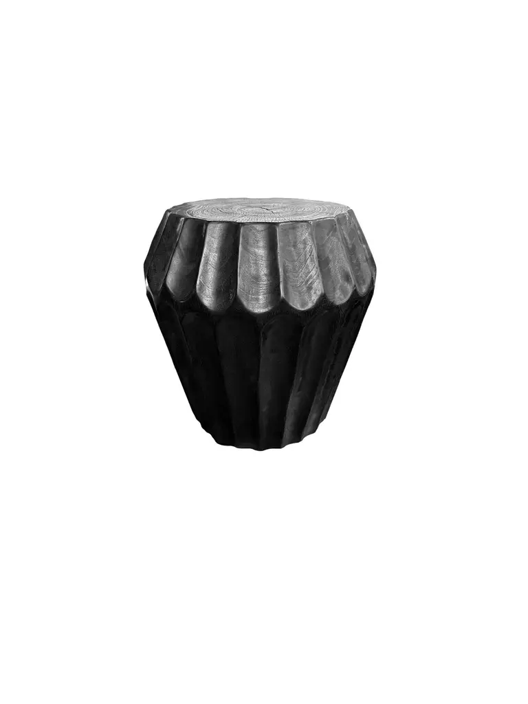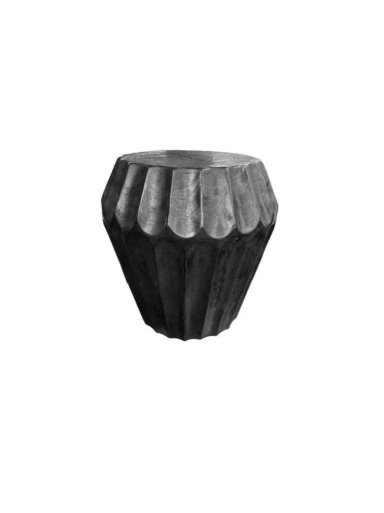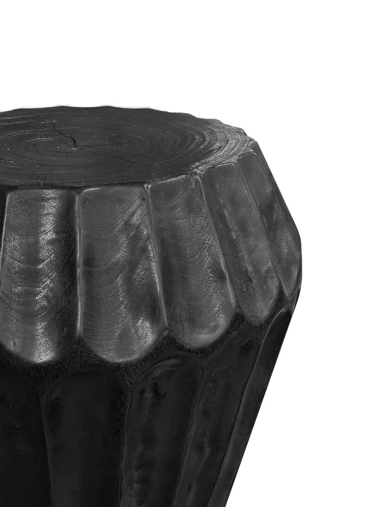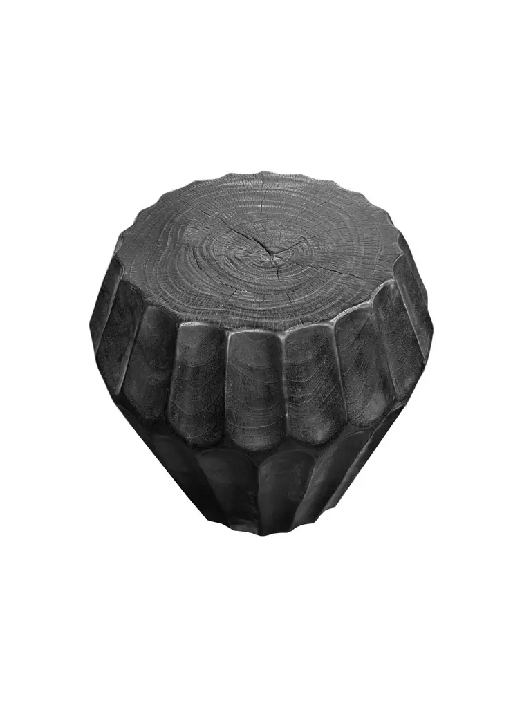 A wonderfully sculpted side table, crafted from a single block of mango wood. It features wonderful wood textures. This table features carved detailing that wraps around its sides. To achieve its burnt finish the wood was burnt several times and finished with a clear coat. This item was carved by skilled artisans on the island of Java, Indonesia. Table top diameter 35cm (13.77in). Diameter at widest point 50cm (19.68in)