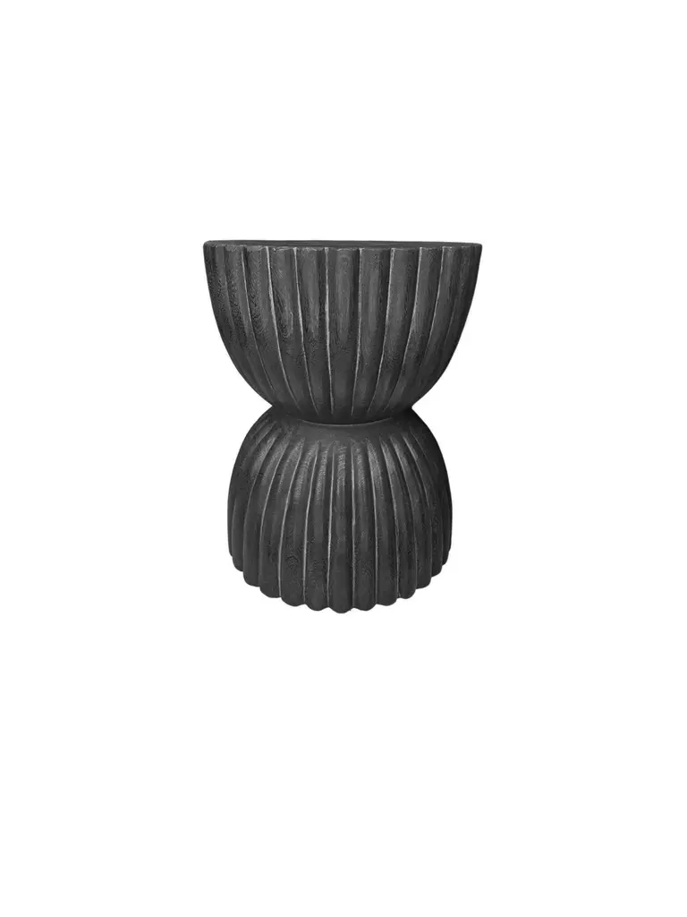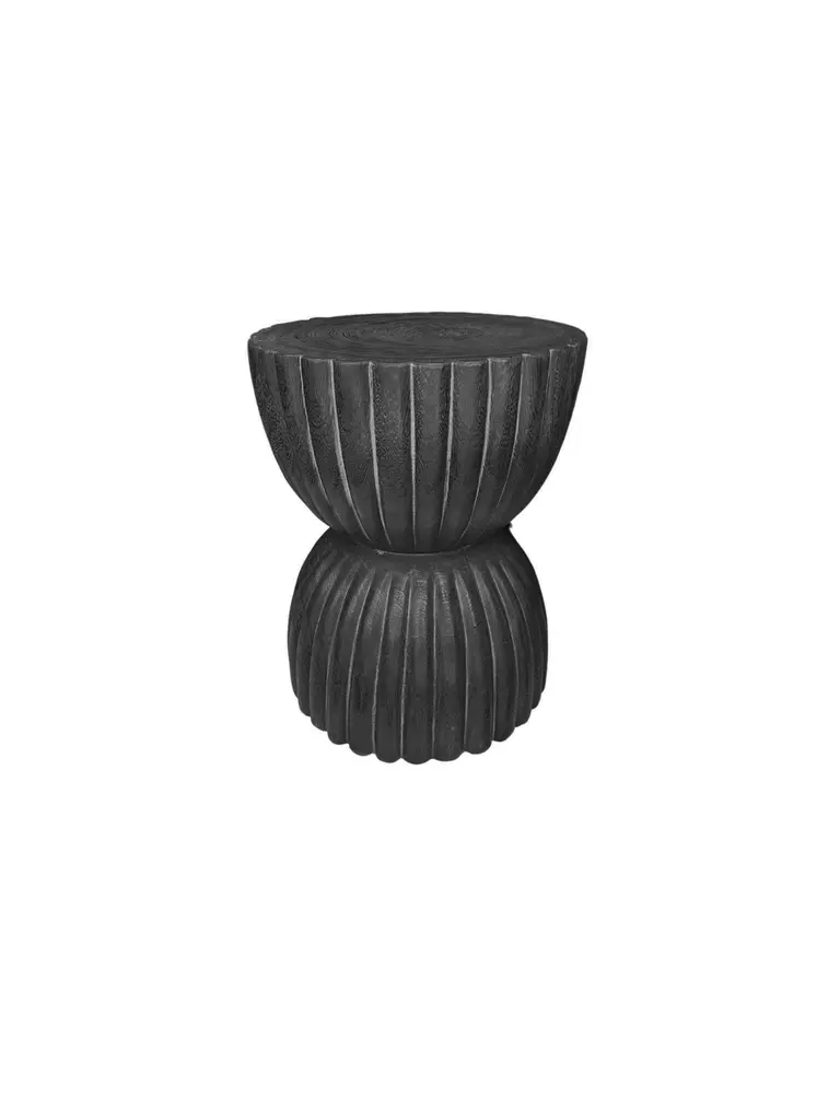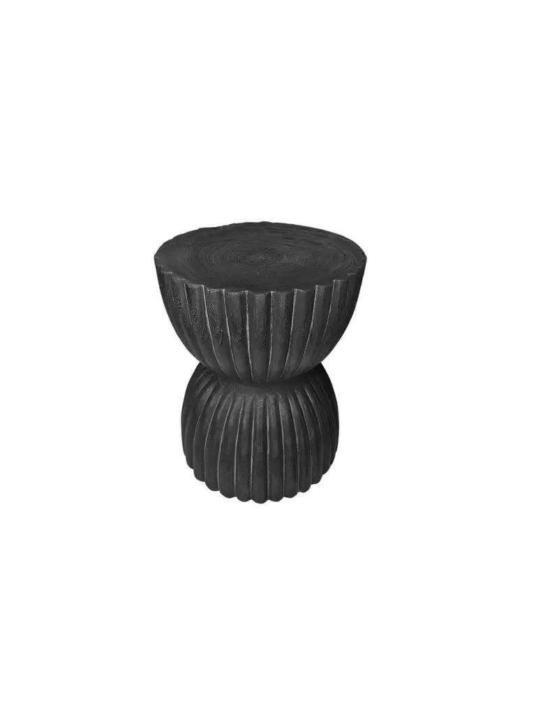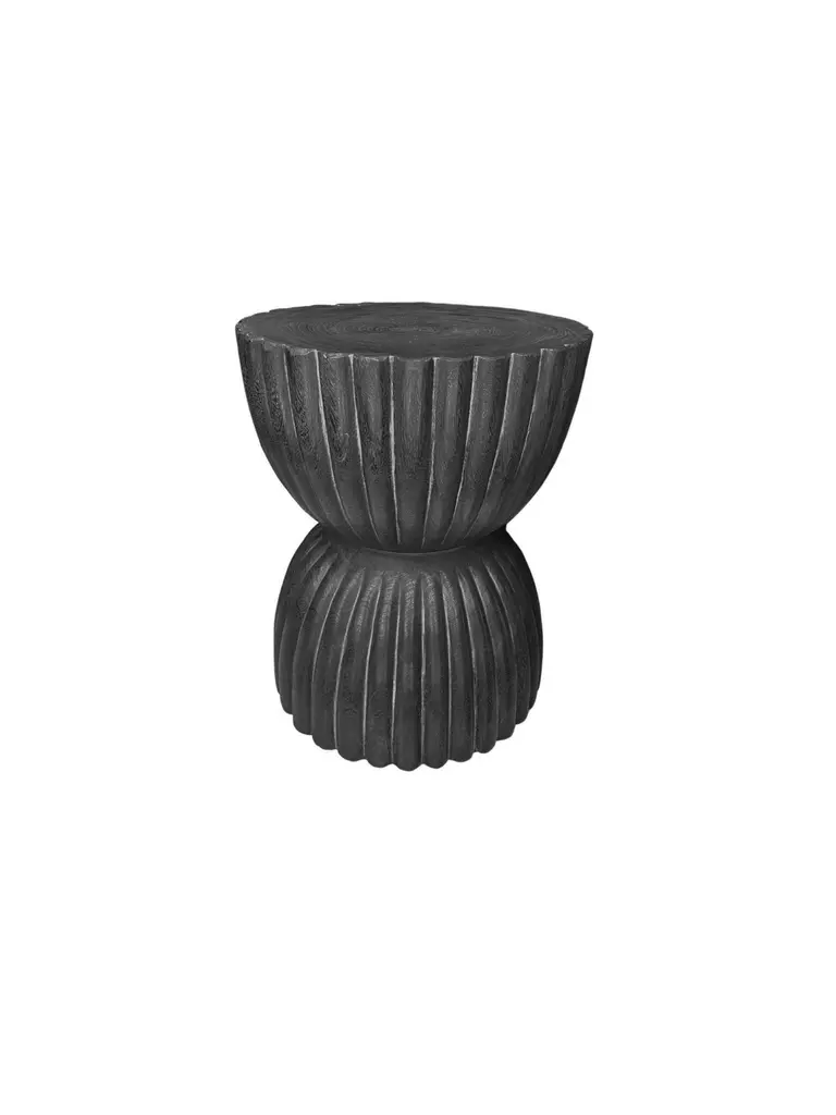 A wonderfully sculpted side table, crafted from a single block of mango wood. It features wonderful wood textures. This table features carved detailing that wraps around its sides. To achieve its black finish the wood was burnt several times and finished with a clear coat. This item was carved by skilled artisans on the island of Java, Indonesia.