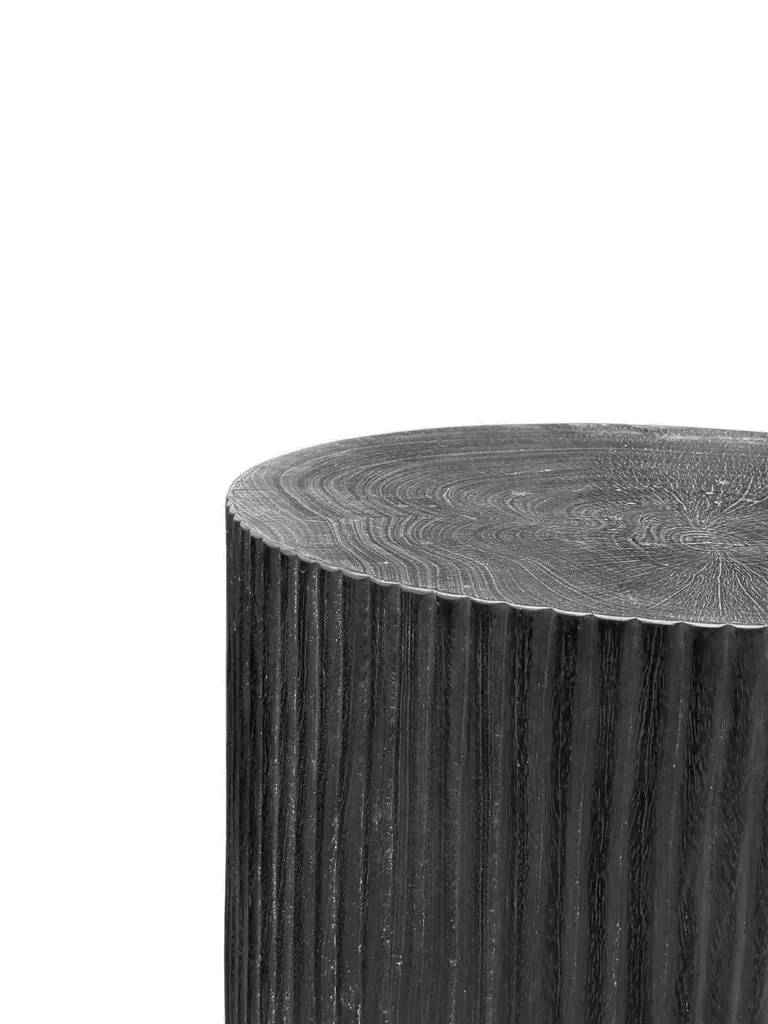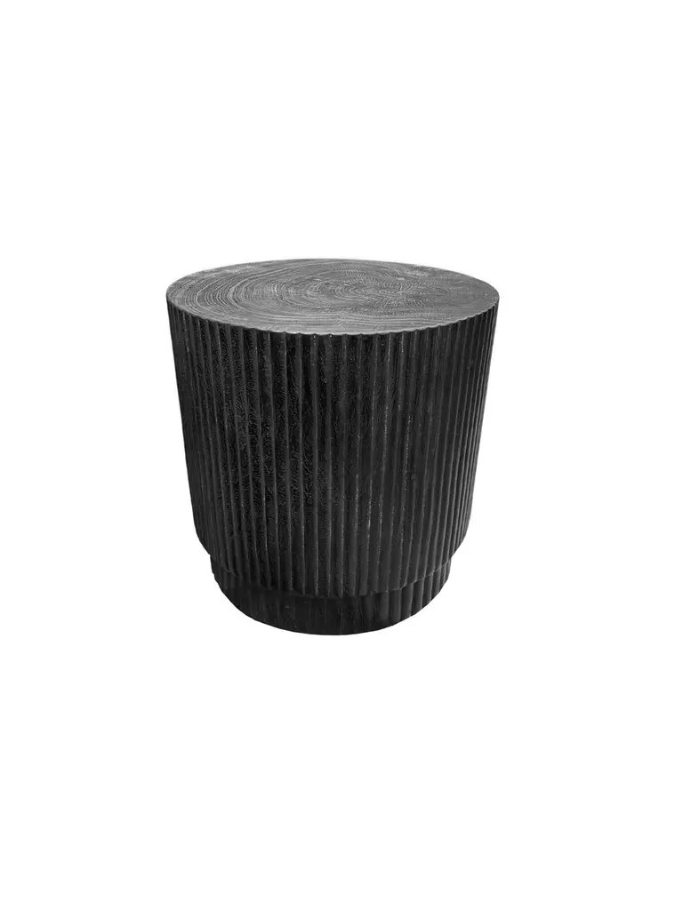 A wonderfully sculpted side table, crafted from a single block of mango wood. It features wonderful wood textures. This table features carved detailing that wraps around its sides. To achieve its black pigment the wood was burnt several times and finished with a clear coat. This item was carved by skilled artisans on the island of Java, Indonesia.