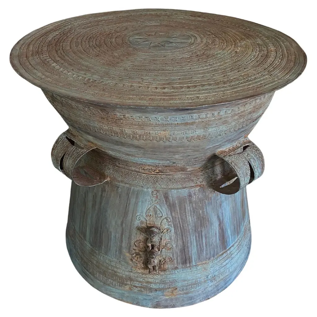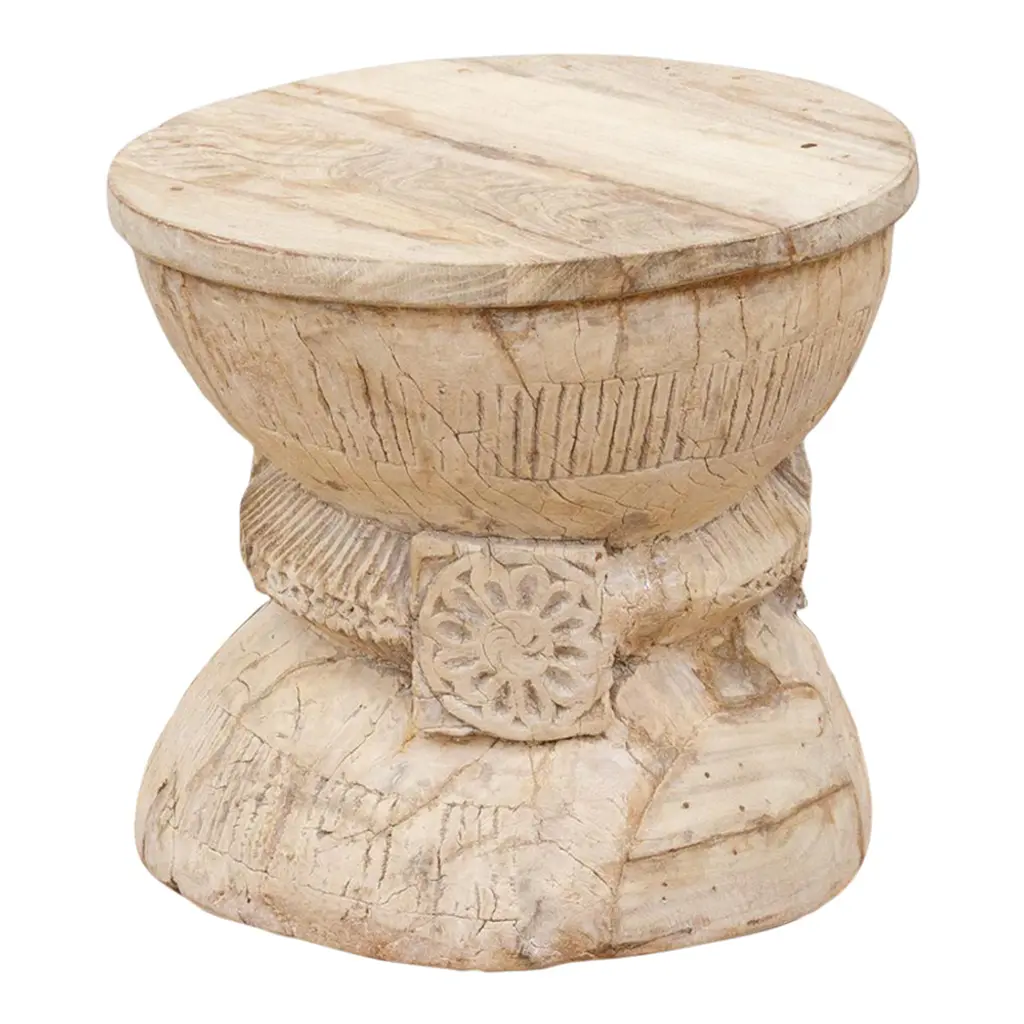 Round Mango Wood Side Table, Carved Detailing, Modern Organic