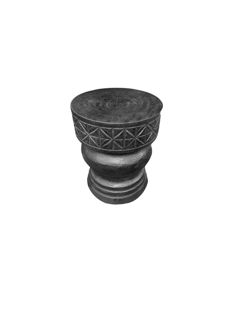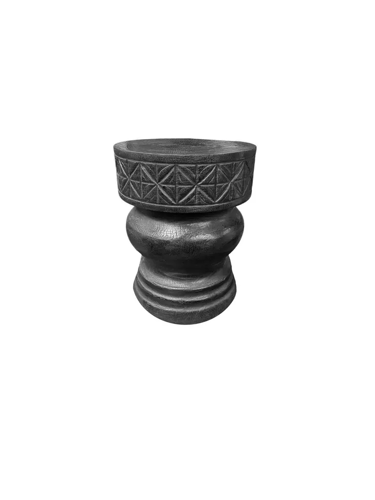 A wonderfully sculpted side table, crafted from a single block of mango wood. It features wonderful wood textures. This table features carved detailing that wraps around its sides. To achieve its black pigment the wood was burnt several times and finished with a clear coat. This item was carved by skilled artisans on the island of Java, Indonesia. The table is perfectly complemented by intricate floral carvings that add a touch of elegance. The handcrafted detailing brings a sense of artistry to any room, making it a stunning focal point. Its sturdy construction ensures durability, while the smooth tabletop provides ample space for your favorite decor or a cozy cup of tea. Ideal for both contemporary and traditional interiors, this side table combines functionality with a charming, organic aesthetic.