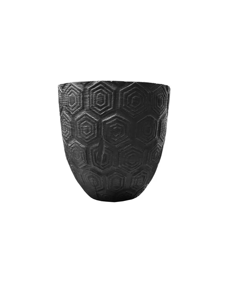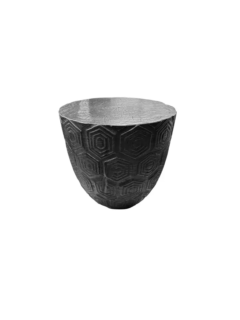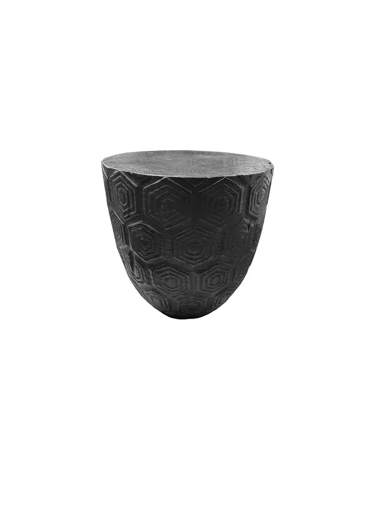 A wonderfully sculpted side table, crafted from a single block of mango wood. It features wonderful wood textures. This table features carved detailing that wraps around its sides. To achieve its black pigment the wood was burnt several times and finished with a clear coat. This item was carved by skilled artisans on the island of Java, Indonesia.