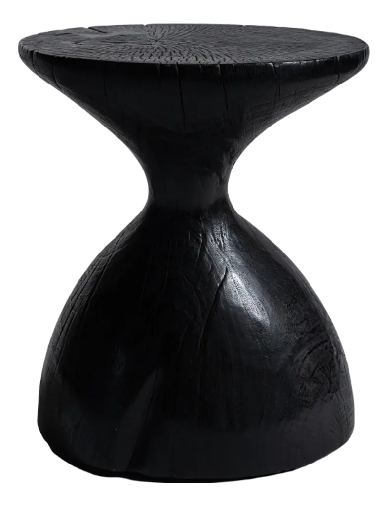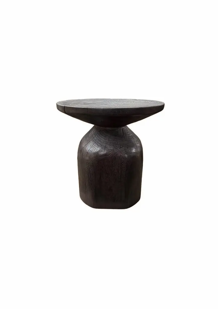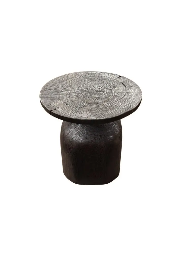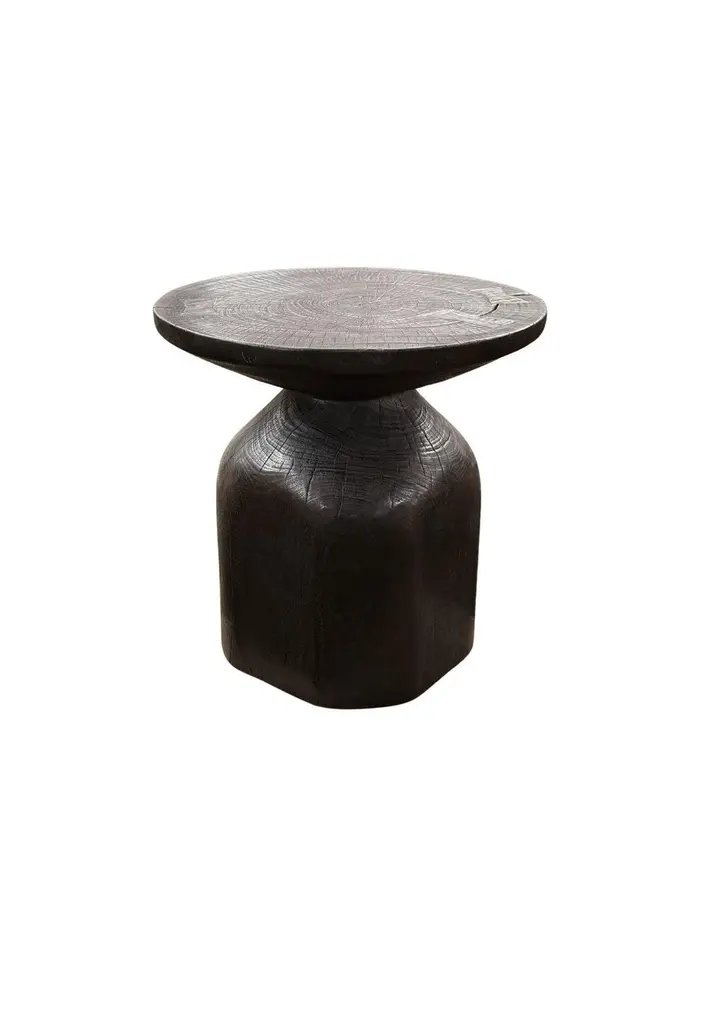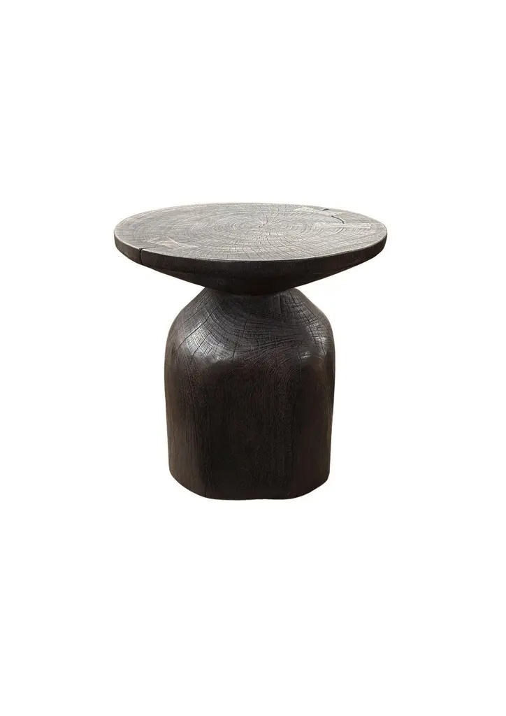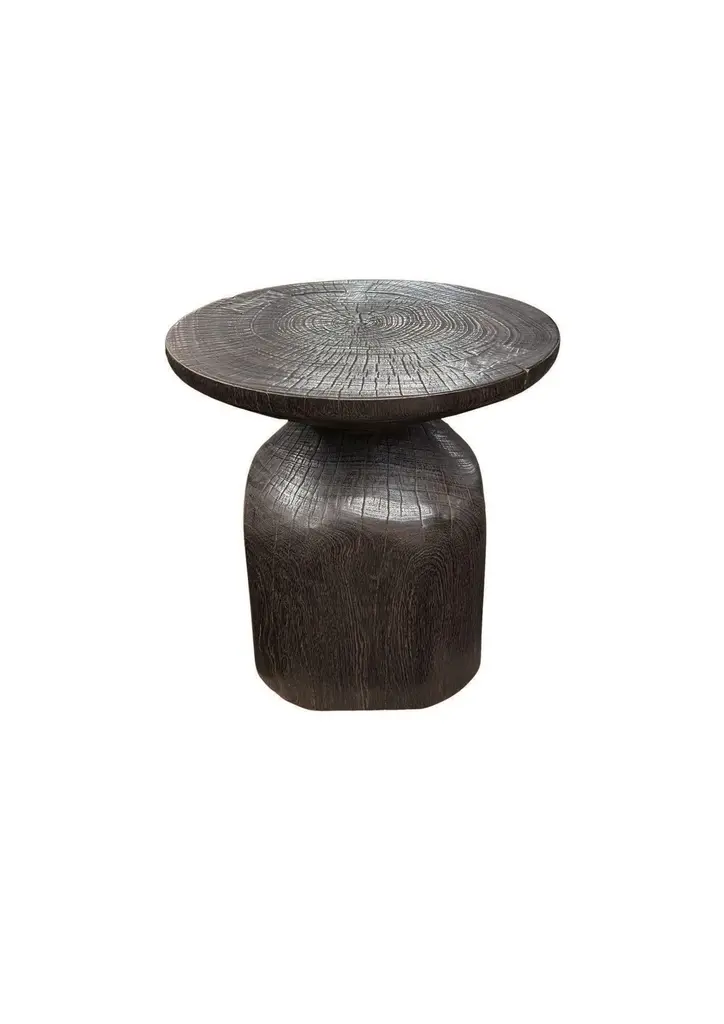 A wonderfully sculpted side table, crafted from a single block of mango wood. It features wonderful wood textures. To achieve its dark brown finish the wood was burnt several times and finished with a clear coat. This item was carved by skilled artisans on the island of Java, Indonesia.