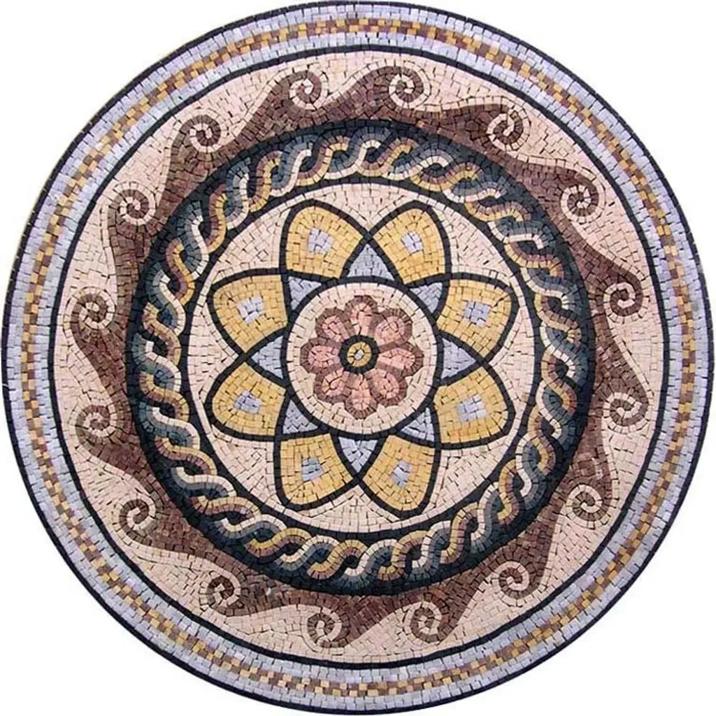 The Lorea round marble flower mosaic is a colorful Romanesque mosaic that will brighten up traditional and contemporary spaces. Featuring a blue and yellow gold flower centerpiece this hand-cut stone design has a bold wave and guilloche border. Use it to craft a distinctive stone kitchen backsplash or top a round table for your eating nook - it will become the focal point of any room.