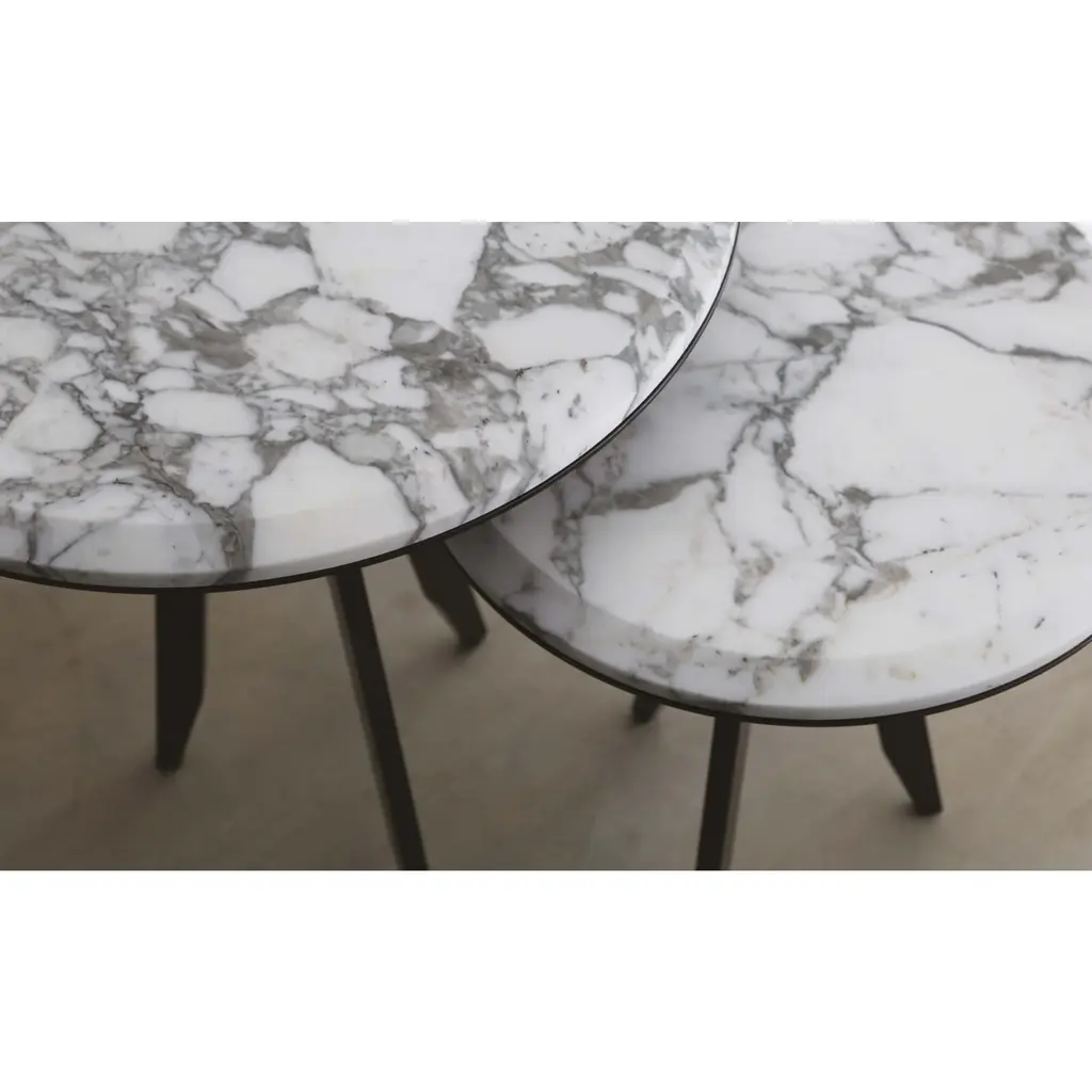 Introducing MIRAGE, a set of small circular side tables that exude sophistication and luxury. Available in different heights and diameters, these tables feature three slim legs tapering to a point and a metal flying disk that perfectly balances a marble top with a tapered border. Choose from a variety of marble and metal finishes for a personalized touch. Elevate your space with this elegant and versatile piece from the CASA CASATI collection.