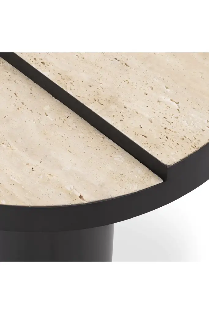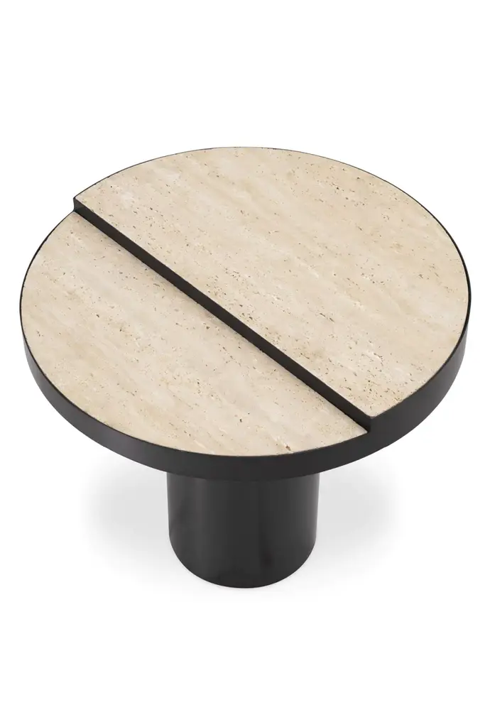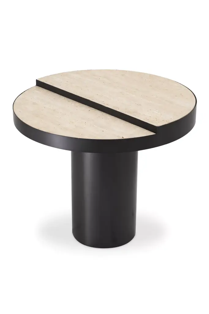 Accent your living room with the ultra-chic Excelsior Side Table by Eichholtz. The exceptional tabletop consists of two semi-circular travertine plates. One part of the tabletop is larger and slightly raised than the other. The base and rim of this striking end table have a bronze finish.