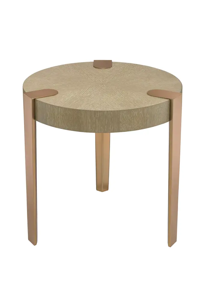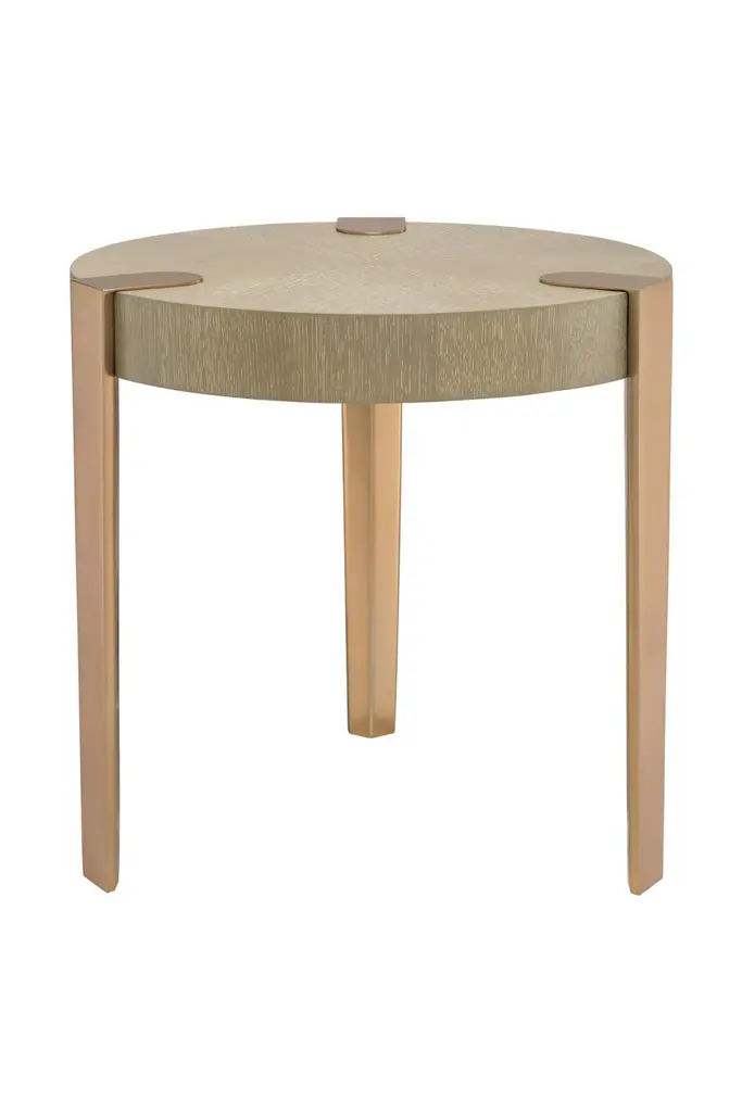 Add a modern and minimalistic touch to your living space with the Oxnard Side Table. It features a round tabletop of washed oak veneer and three legs in a brushed brass finish. Whether you are going for a retro or contemporary look, this stylish accent table will be a perfect choice.