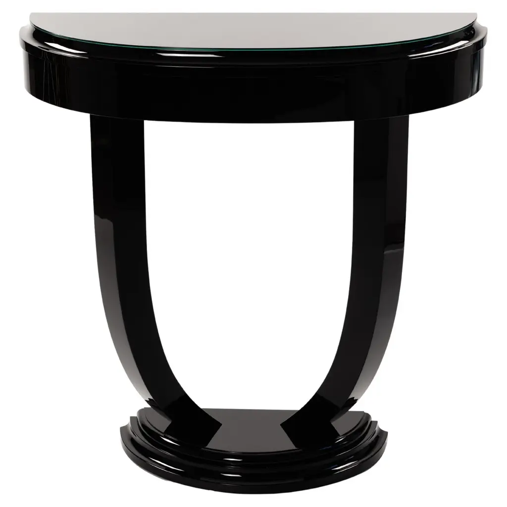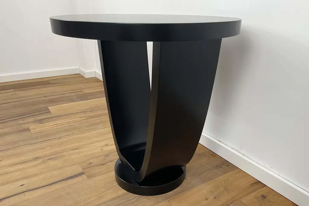 Side table in Art Deco style matt black lacqueredArt Deco side table style furniture - own designWith this design we were inspired by the Art Deco and Bauhaus tables and created a very beautiful side table in the Art Deco style. Noble and elegant, this side table fits into almost any room concept. Period furniture is made to order by us (approx. 3-6 weeks), we are happy to manufacture it according to your individual wishes - other dimensions, veneer, color etc.Measures: Height: 63cmWidth: 60cmDepth: 60cmDesigned and manufactured by Tischlerei Hänsdieke GmbH.