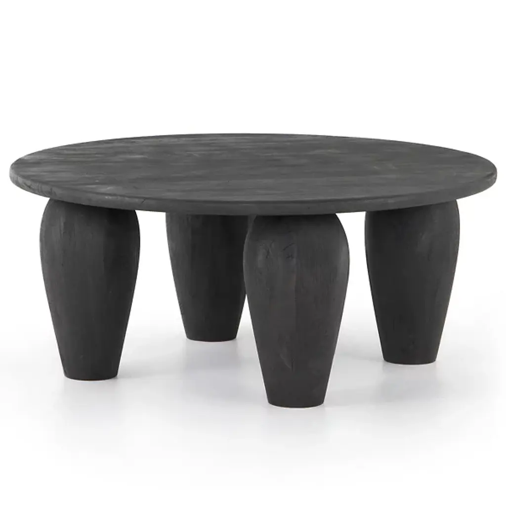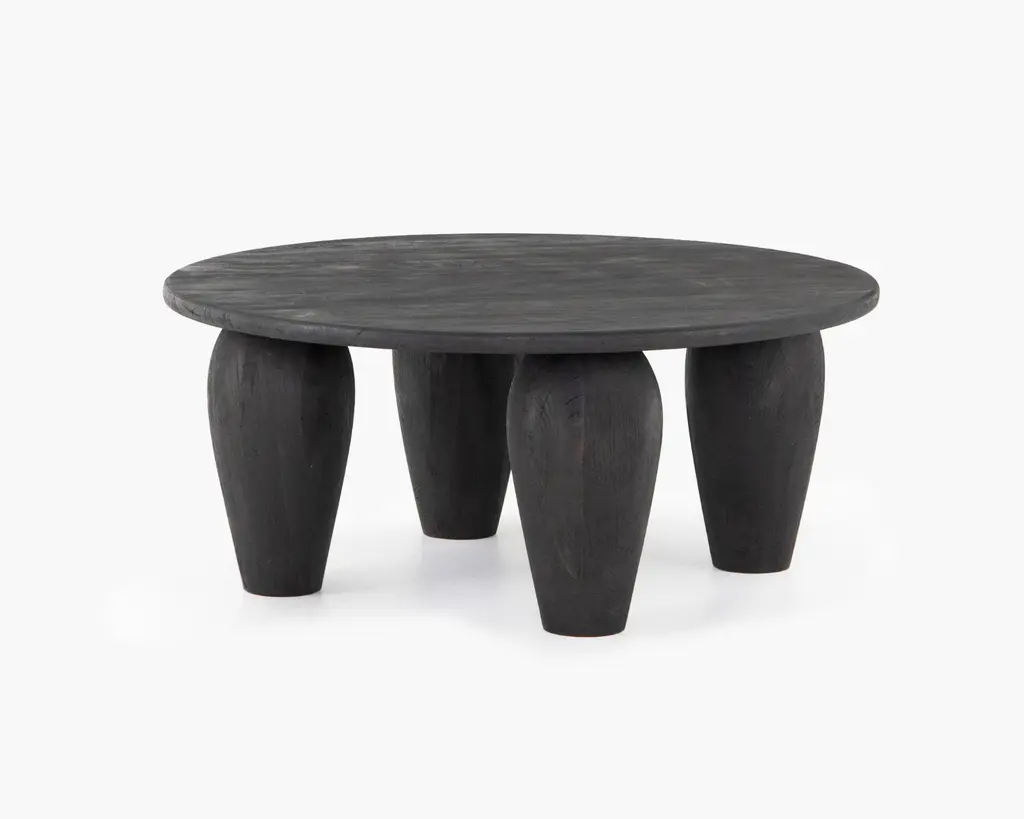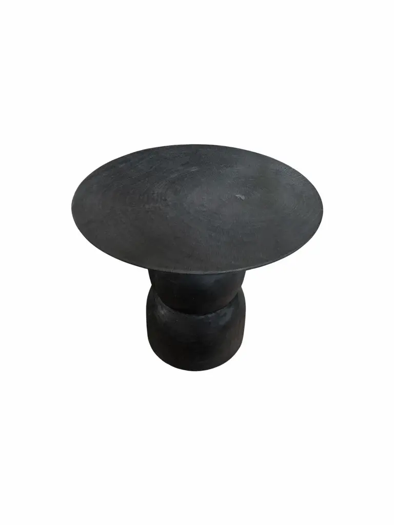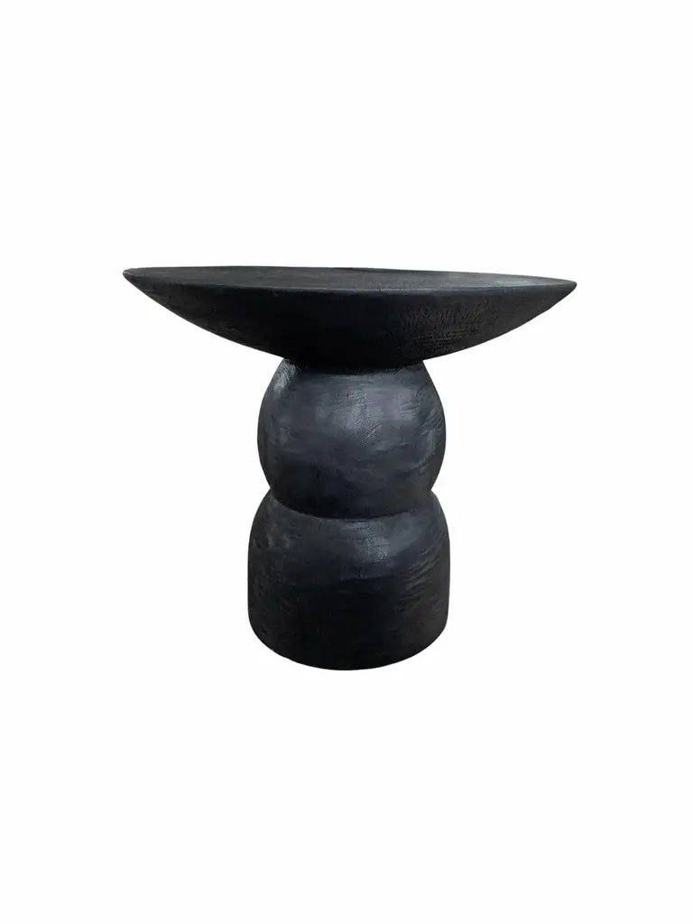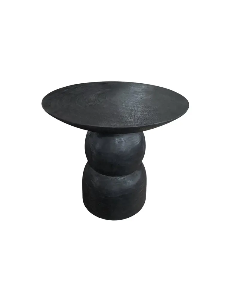 A wonderfully organic round side table. Its rich black pigment was achieved through burning the wood three times. Its neutral pigment and subtle wood texture makes it perfect for any space. A uniquely sculptural and versatile piece certain to invoke conversation. This table was crafted from mango wood and has a smooth texture.