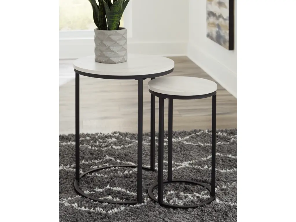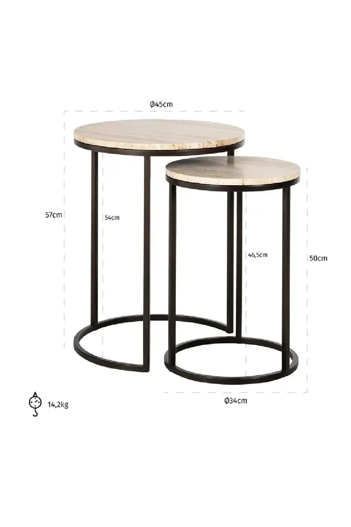 Elevate your living space with the set of 2 Avalon Nesting Side Tables from the European brand Richmond Interiors. Featuring exquisite travertine tops, these side tables exude natural beauty and sophistication. The contrasting black metal base not only adds a modern industrial flair but also ensures stability. They're equally beautiful when used individually or as a set. The smaller of the two tables is crafted to perfectly fit under the larger one, allowing you to create more space or showcase their stunning design in tandem.