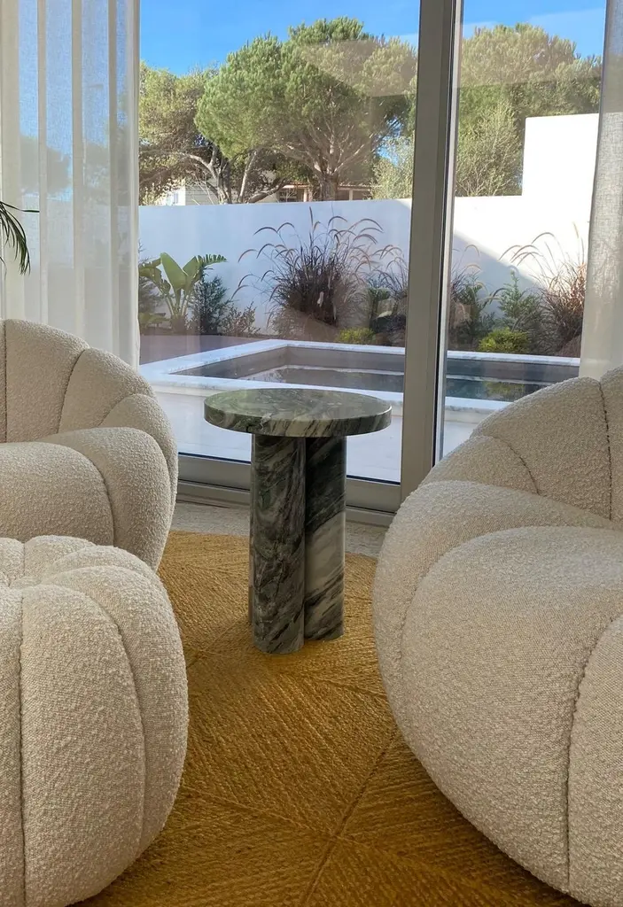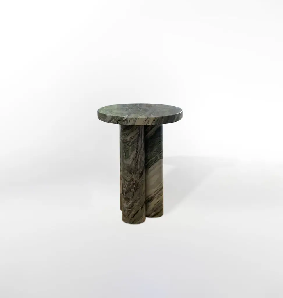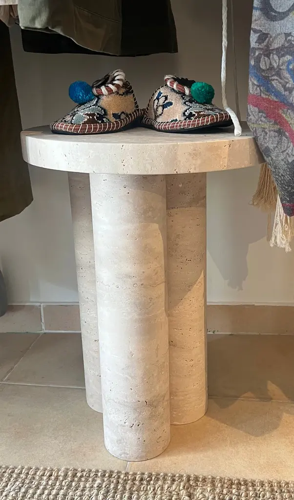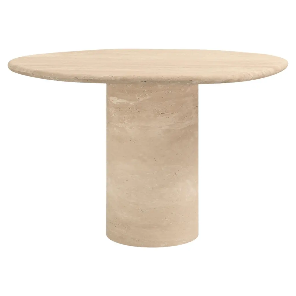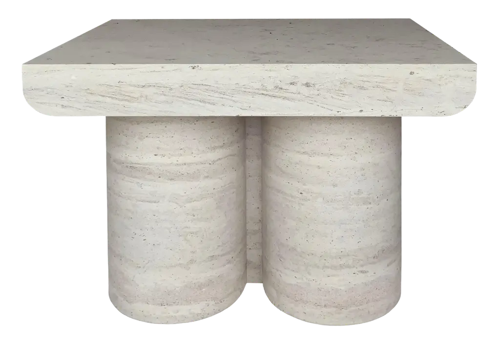 This minimalist table is made from solid travertine, featuring a circular table top that elegantly and securely sits on three cylindrical columns. Drawing inspiration from the vintage pieces of Mario Bellini, the column legs give this table a sculptural feel. A perfect accent piece for placing next to your sofa, it effortlessly blends style and functionality.This item available made-to-order as shown and in custom diameters.Not all travertine is created equal - we searched high and low for the perfect blocks to create this collection.The top and legs are packed separately for ease of transport and installation.