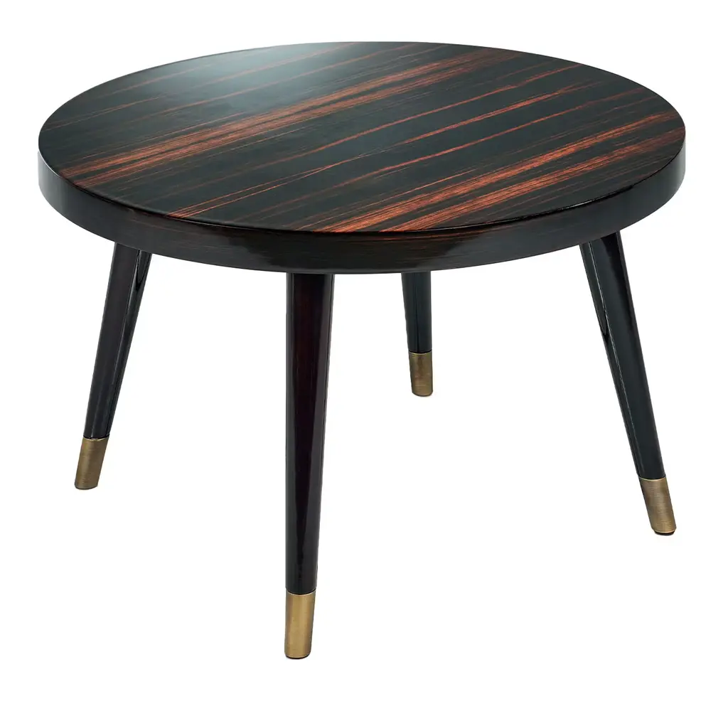 Showcasing beautiful walnut burl veneer. The table's circular top and clean-lined silhouette create a modern canvas that allows the wood's stunning natural patterns to take center stage. The elegant design is supported by four gracefully tapered legs, each finished with refined brass caps that add a touch of luxury while complementing the warm tones of the burl veneer.This versatile accent piece works beautifully as a side table, end table, or as a sophisticated addition to any seating arrangement. The combination of exceptional materials and thoughtful design creates a timeless piece that bridges classic craftsmanship with contemporary style.Dimensions: 28" W x 28" D x 27" H
