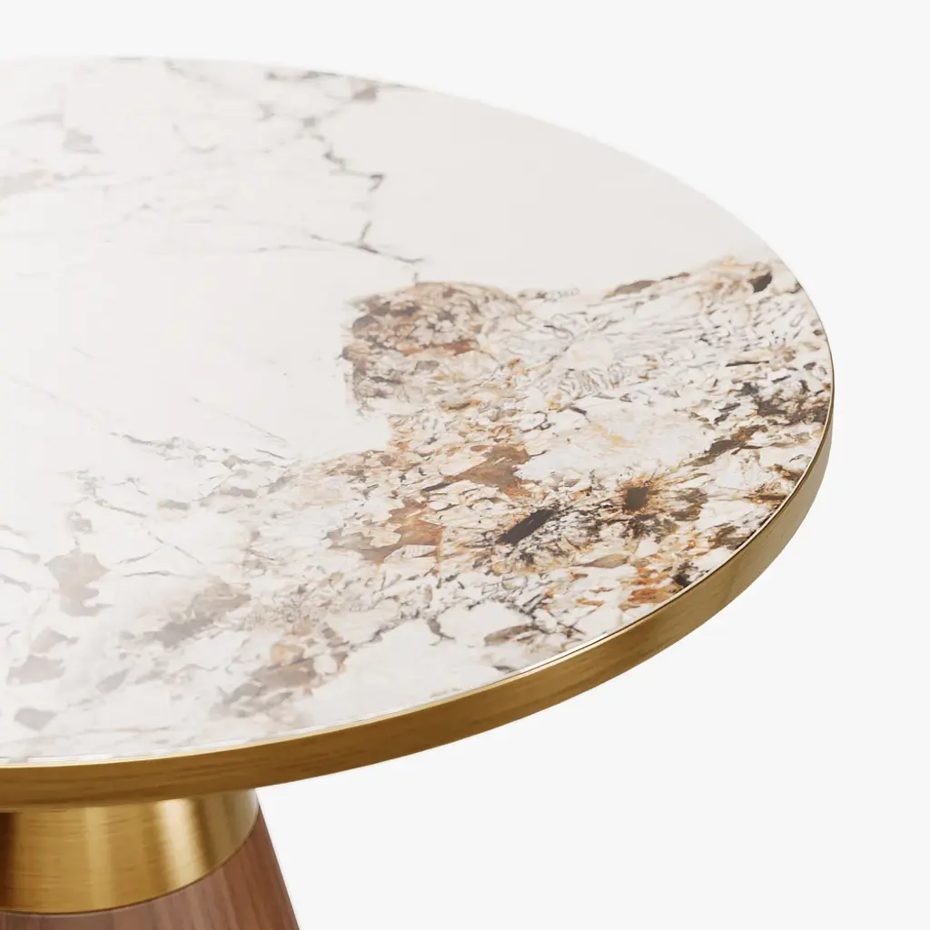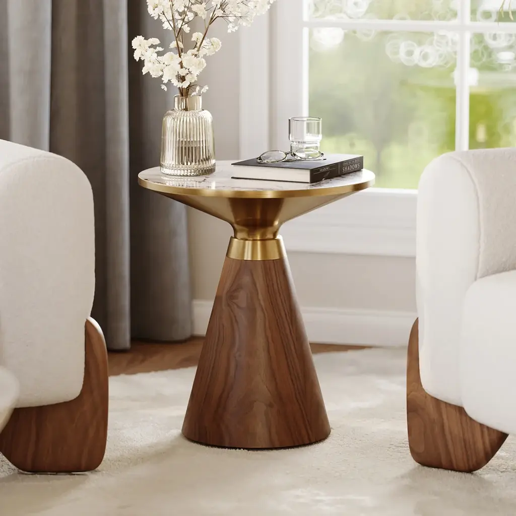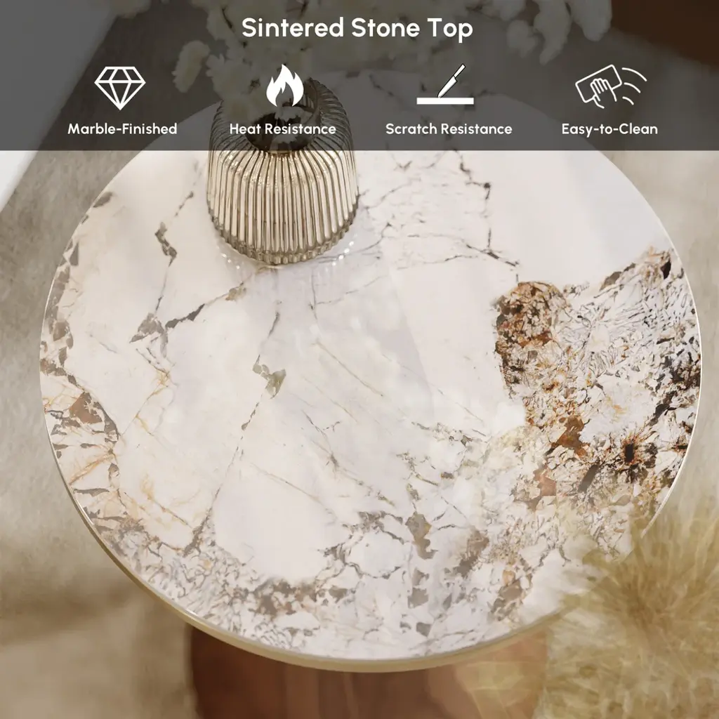 Modern and creative hourglass shape design is simple, generous, and useful. The natural Sintered Stone tabletop design of the end table is elegant, generous, and useful. The frame and base with stainless steel are sturdy and durable. The smooth Sintered Stone top provides a perfect platform for framed photos, plants, coffee, or magazines.