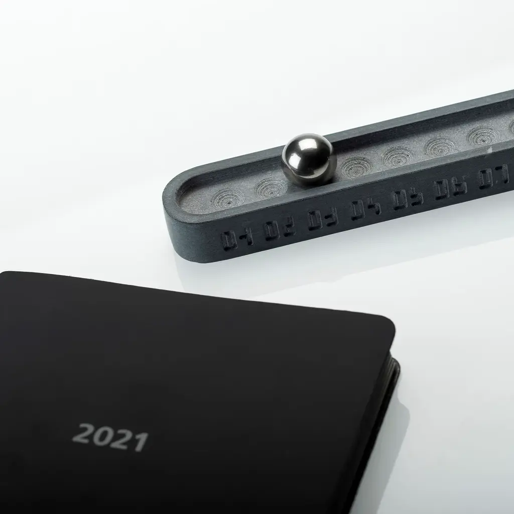 The essential design marking this table calendar in Nero Rabat marble makes it an ideal complement piece for consoles or desks in contemporary settings. A celebration of one of the first methods to mark time, it is comprised of a metal sphere that passes from a slot to another and reminds of the Chinese checkers. Brimming with timeless elegance, it also comes in a white Carrara marble variant.