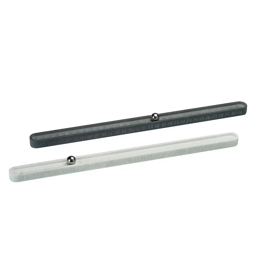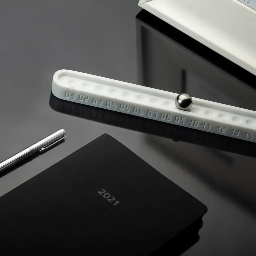 A streamlined silhouette in white Carrara marble where a metal sphere can be moved from a slot to another to quietly mark the passage of days defines this unique table calendar. As elementary as it is elegant, it celebrates one of the most ancient calendars and the Chinese checkers in a single design. A version in Nero Rabat marble is also available.