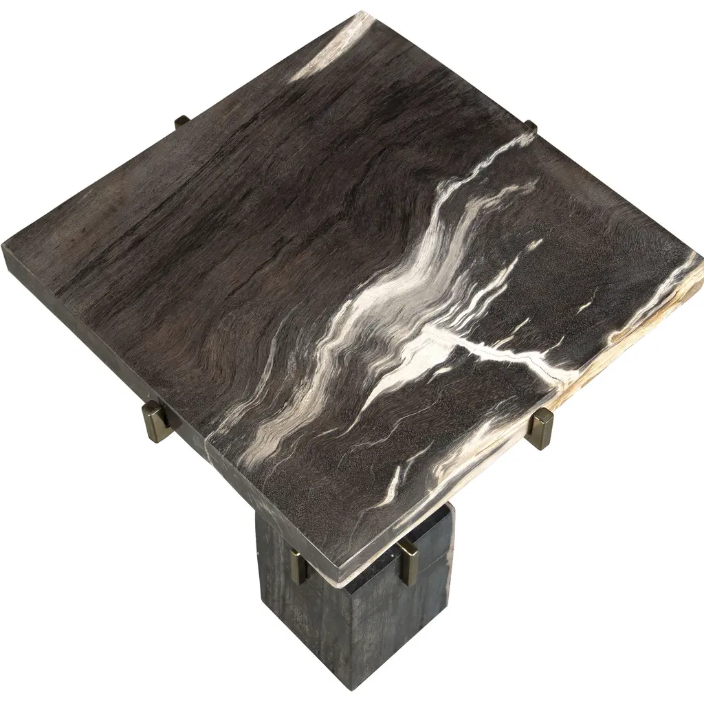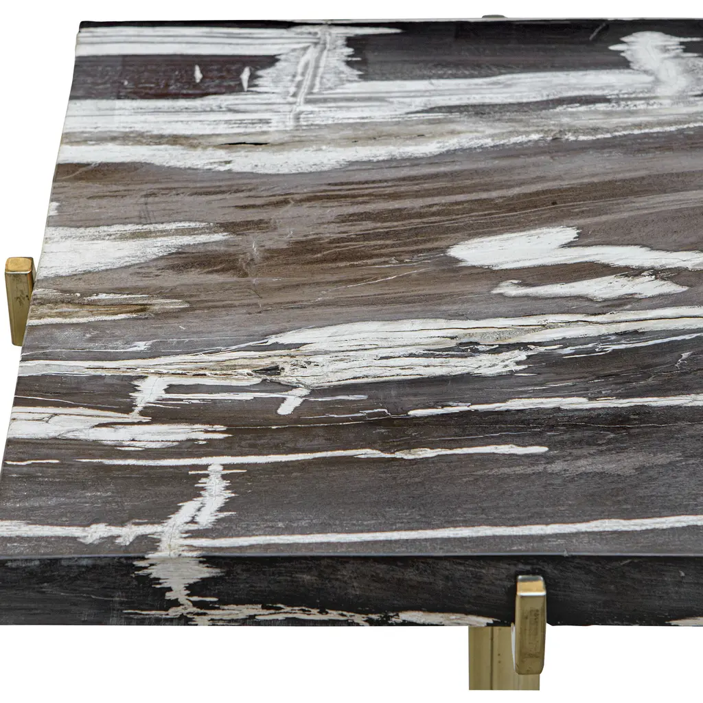 This Accent Table Features A Gold Finished Stainless Steel Base With Four Prongs Hugging The Petrified Wood Top And Base. True To The Nature Of Natural Materials, Each Piece Will Vary.