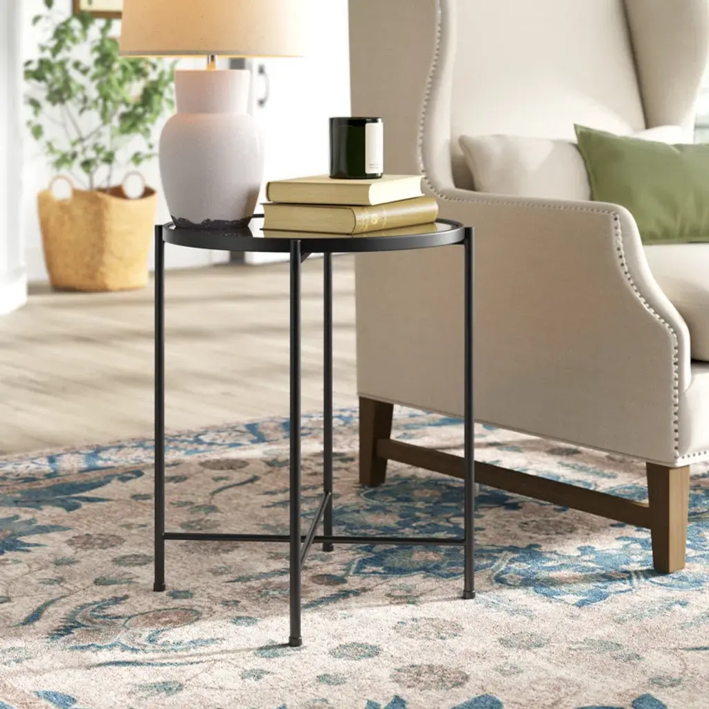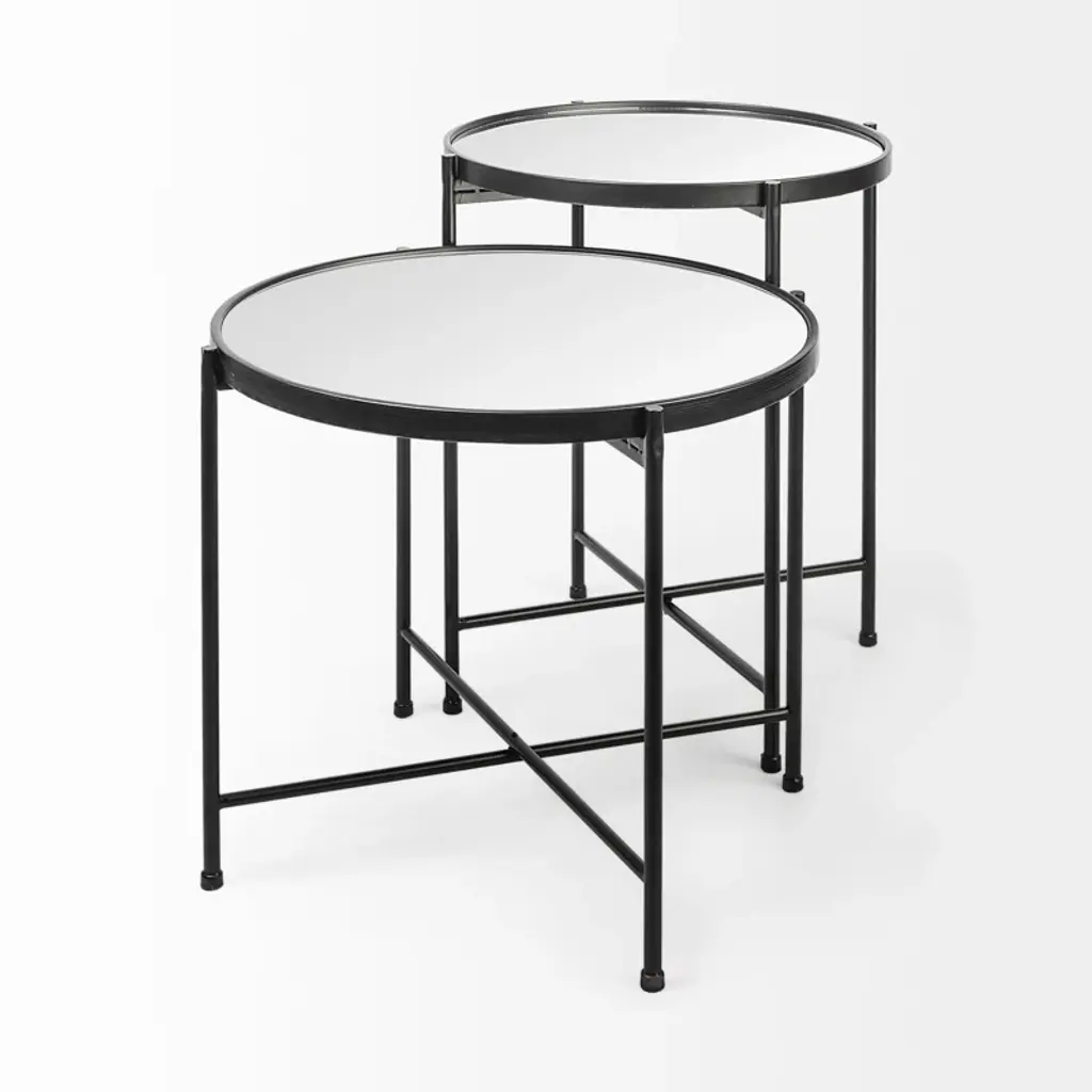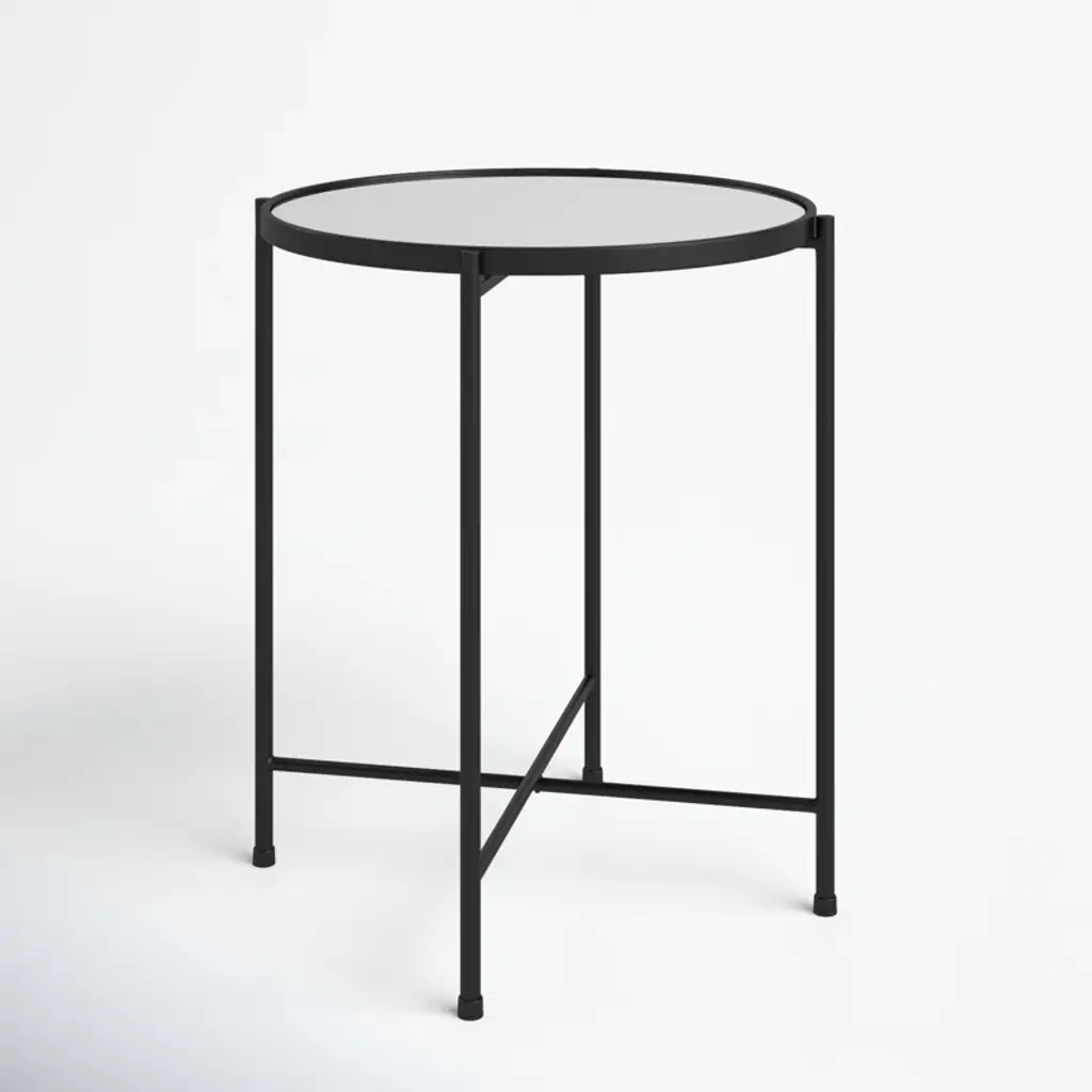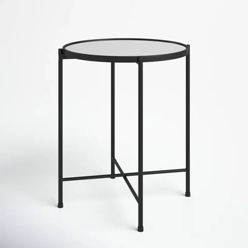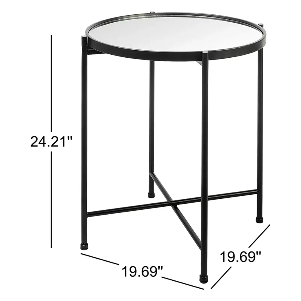 A modern minimalist accent table with a smooth black metal finish, criss-cross base and round mirrored top.