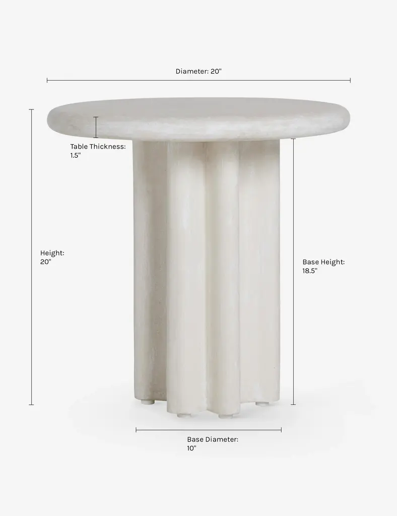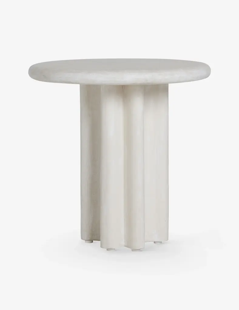 Bold design and supple curves define this round dining table. In an ivory finish, it epitomizes tailored minimalism with soft, rounded lines and concave legs that create its sculpted profile. Cement construction makes this end table the perfect finishing touch for a patio or sunroom, offering lasting style indoors or out.