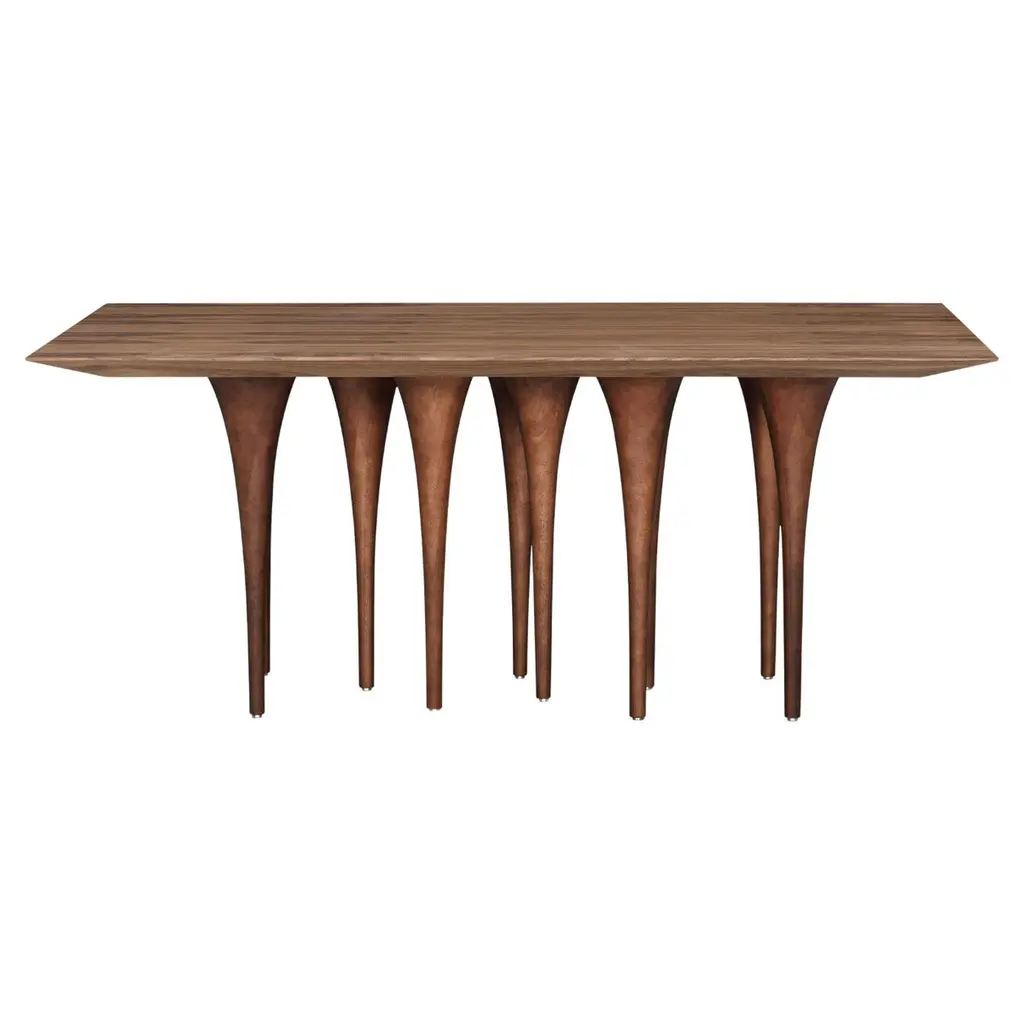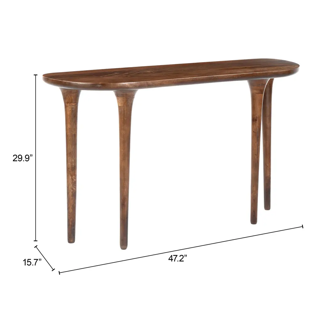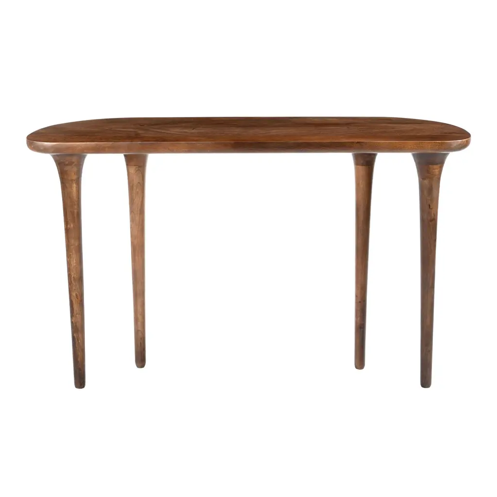 Crafted of wood in a warm walnut finish, the elegant Rune console table features a curved, organically shaped oval top with long and slender tapered legs. This sculptural foyer table adds refined modern charm to an organic silhouette showcasing the unique grain patterns of mango wood. Designed with one longer edge for easier placement against a wall, this curvy accent table saves space in an entry, hallway, and rooms of all sizes.