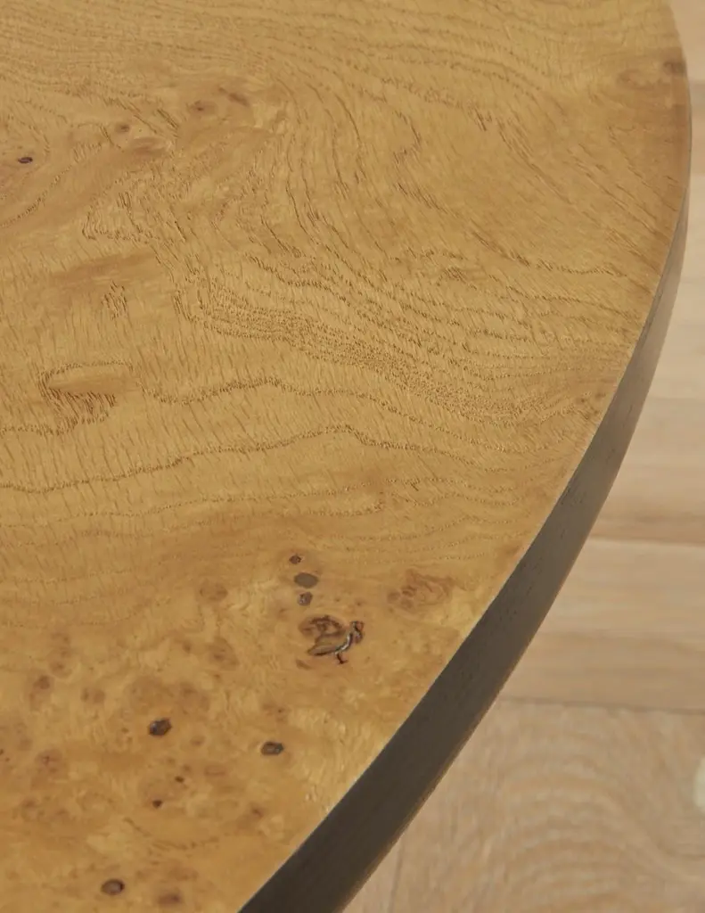 The edge of the top has been left square in order to accentuate the crisp outline of the shape. The under edge has been softened to enhance the organic shape we revere.Available in your choice of either natural burr oak or vintage burr oak.