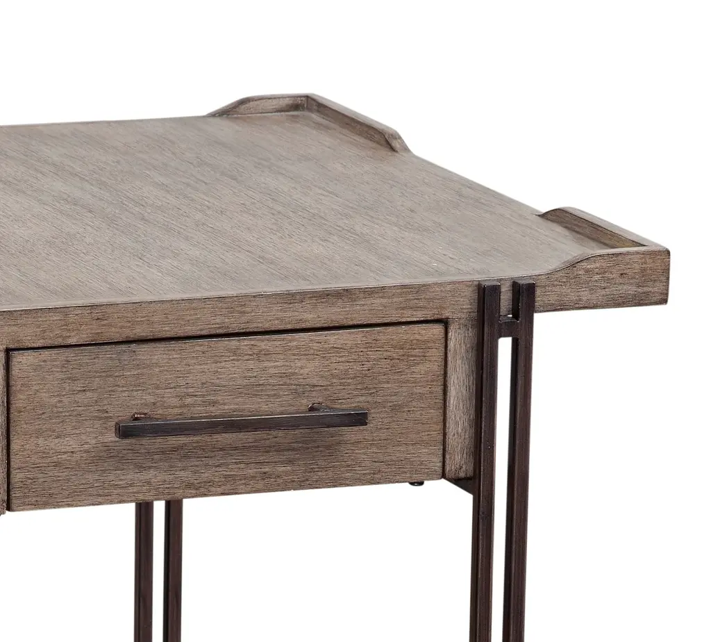 Orren Rectangular End table has one drawer with rustic bronze oversized drawer handles, bottom shelf for storage. Metal ball bearing side glides. Exterior double rustic bronze steel leg detail. Finish: Grayed birch / rustic bronze. Material: MDF, steel .COO: Vietnam.