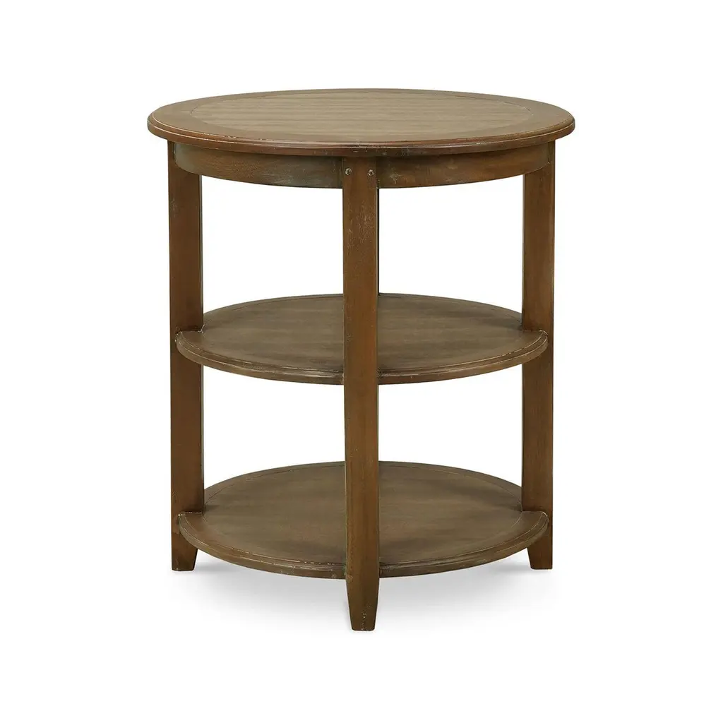A perfect blend of rustic charm and practical functionality. This round end table features a wooden frame finished in a warm, inviting straw wash, providing both durability and a timeless appeal. The table's three-tier design, offers ample space for storage and display of your favorite decorative items, books, or essentials.The table's simple, clean lines and natural finish make it a versatile addition to any living room, bedroom, or hallway. Its rustic aesthetic seamlessly complements both contemporary and traditional interiors, adding a touch of elegance and warmth to your home decor.Dimensions: 24" W x 24" D x 27" HCustom finish options are also available. Contact us to learn more.
