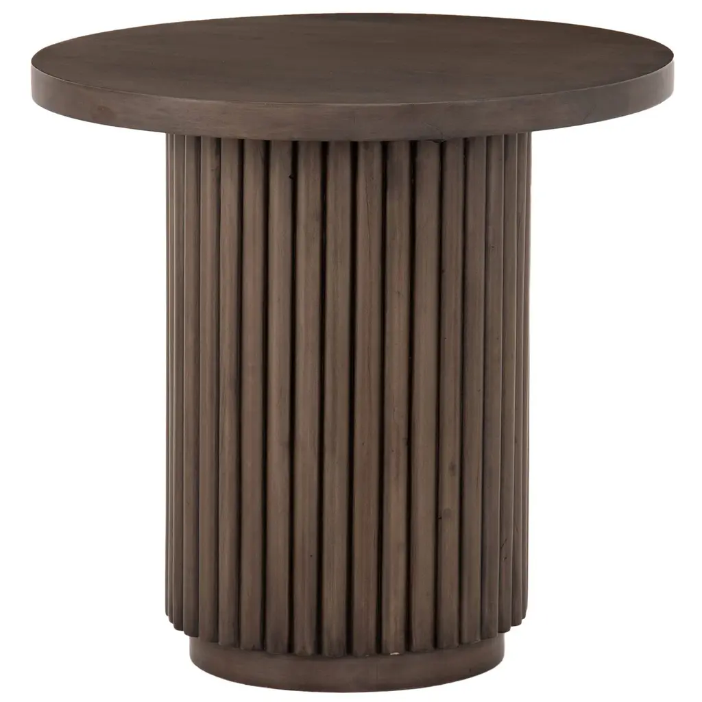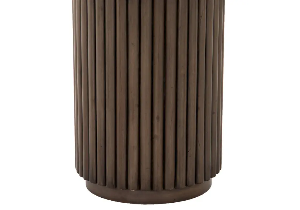 Inspired by architecture in India, this handsome table boasts eye-catching vertical reeding balanced by a smooth, rounded base and top. Crafted from mixed reclaimed wood and finished in brown, its rich coloring and natural wood grains elevate its tasteful design.