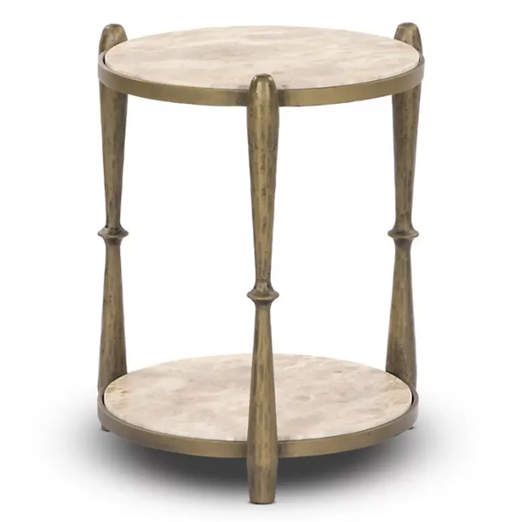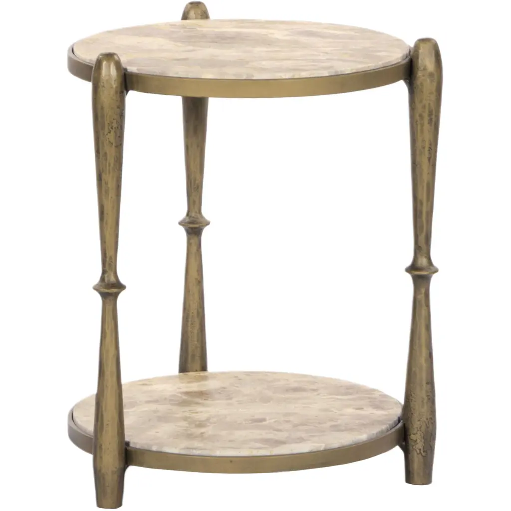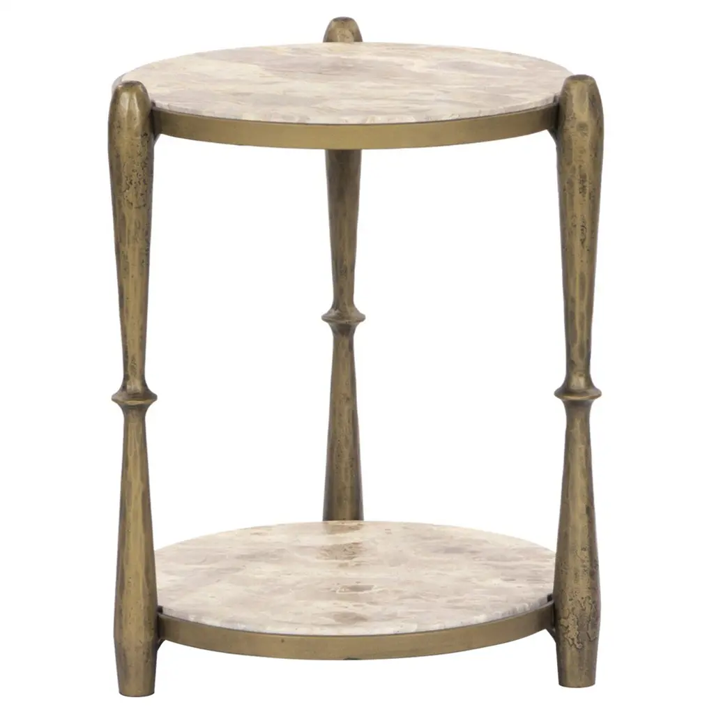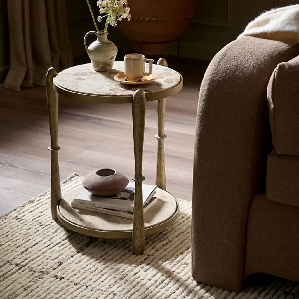 The Ruthie End Table from Four Hands combines hammered iron with marble in an artisan-inspired design. The aged brass finish frames two inset marble shelves, creating a luxurious tiered effect. Turn-style legs add character to the heritage-influenced aesthetic. This table supports up to 100 pounds and provides the perfect spot for drinks, books, or treasured objects. The blend of materials and handcrafted details make this piece both purposeful and decorative. Its proportions work well next to seating areas, making it an accessible addition to any room arrangement.