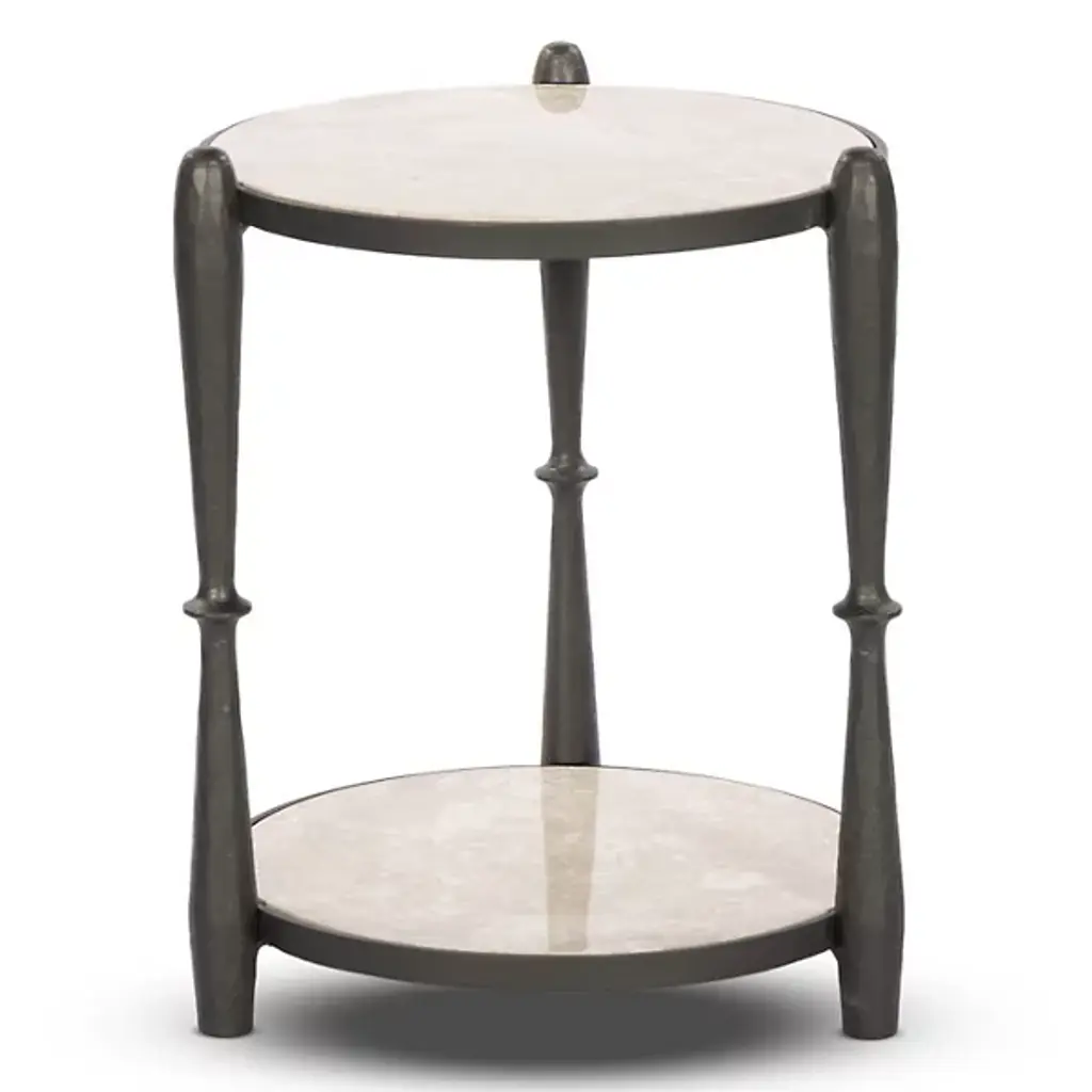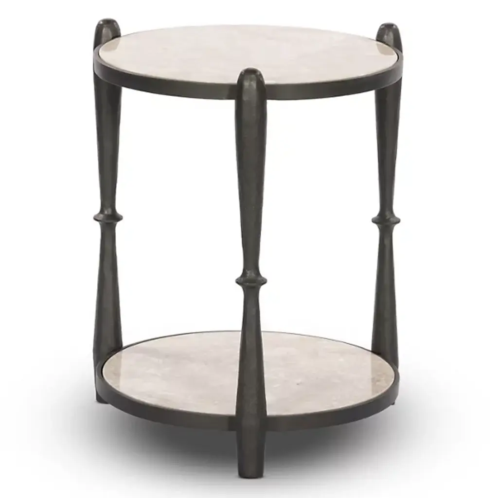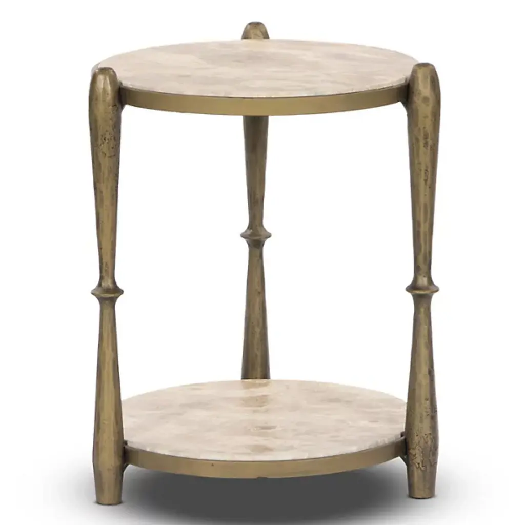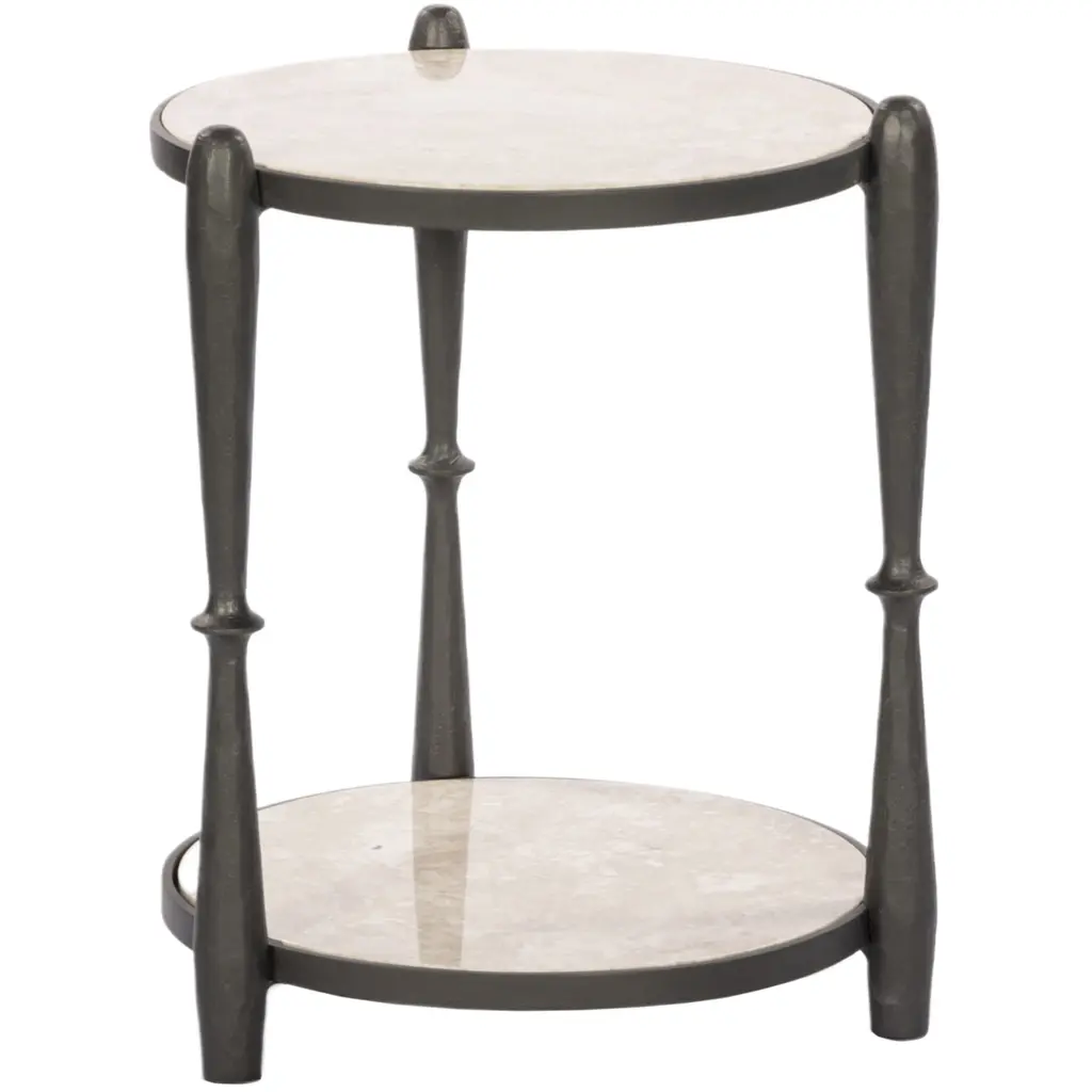The Ruthie End Table from Four Hands combines hammered iron with marble in an artisan-inspired design. The aged brass finish frames two inset marble shelves, creating a luxurious tiered effect. Turn-style legs add character to the heritage-influenced aesthetic. This table supports up to 100 pounds and provides the perfect spot for drinks, books, or treasured objects. The blend of materials and handcrafted details make this piece both purposeful and decorative. Its proportions work well next to seating areas, making it an accessible addition to any room arrangement.