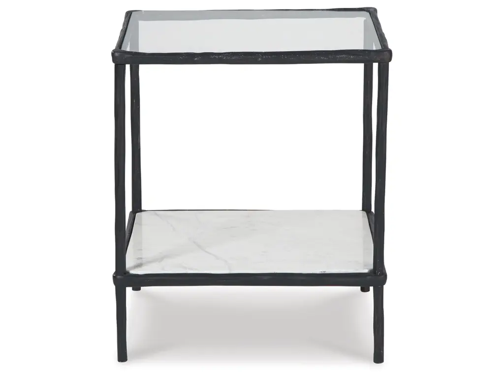 Classic in design with a dash of textural appeal, the Ryandale accent table provides both flair and function. The glass tabletop offers the perfect perch for a lamp, while the white marble lower shelf is ideal for resting trendy coffee table books and other decorative pieces. An antiqued black finish on the frame has an edgy look that remains versatile, suiting spaces from casual to contemporary.
