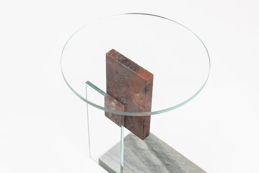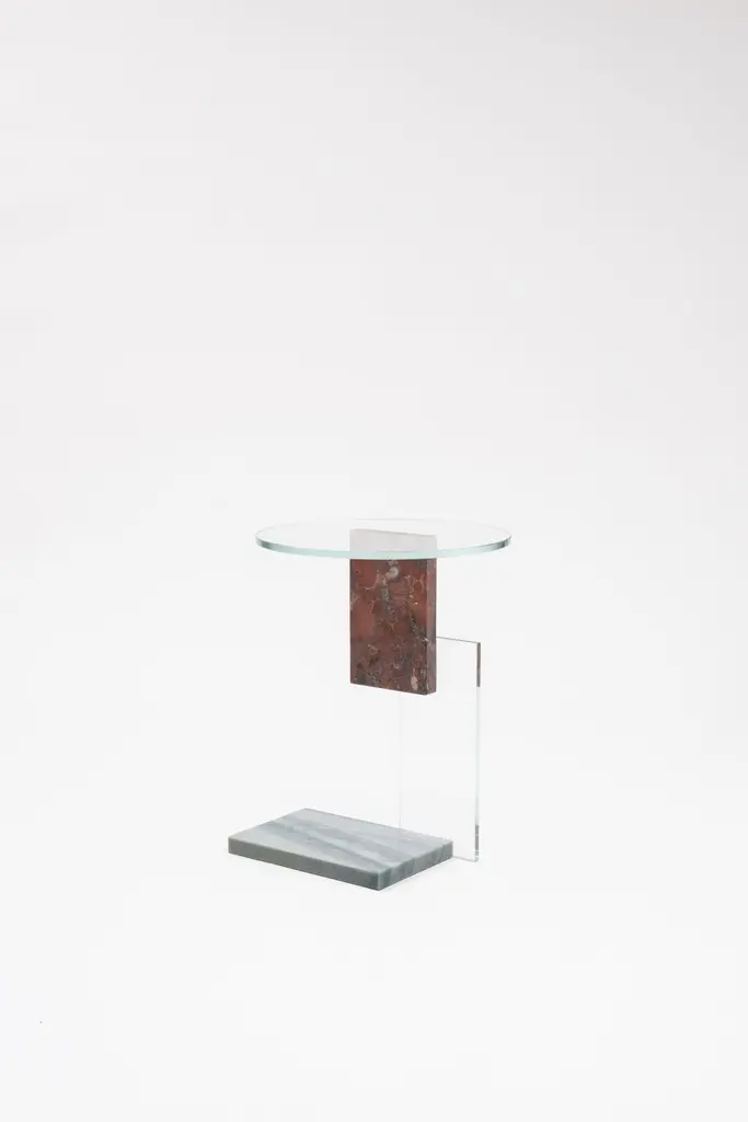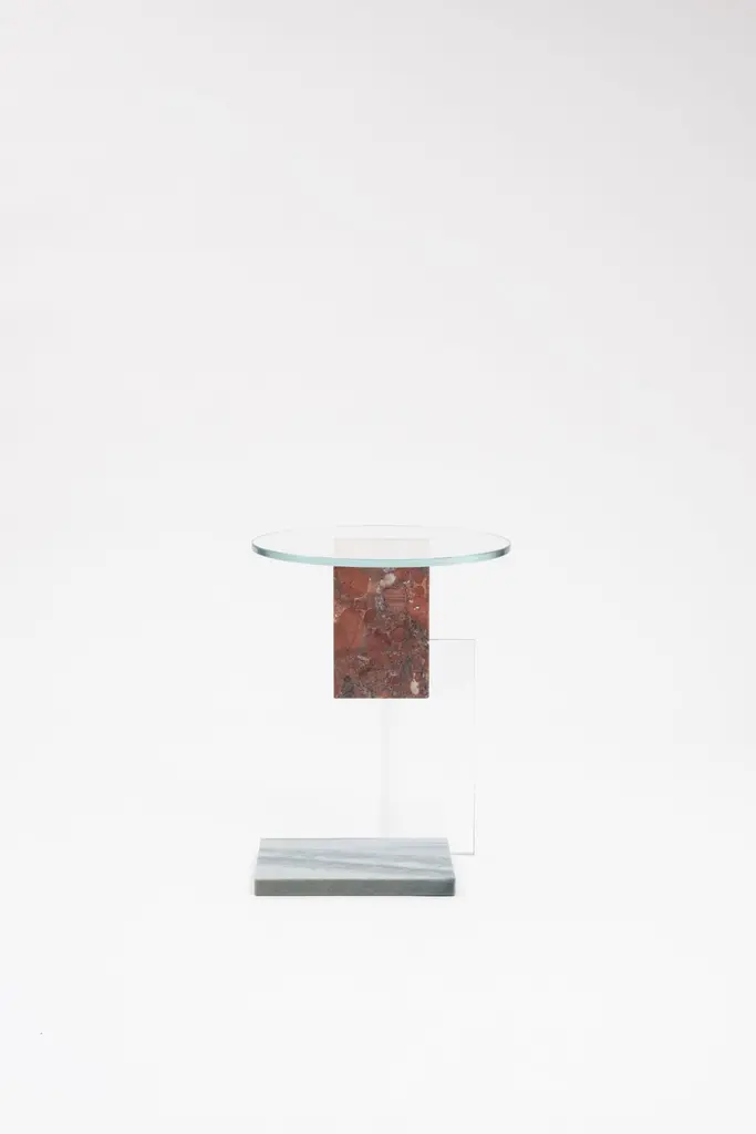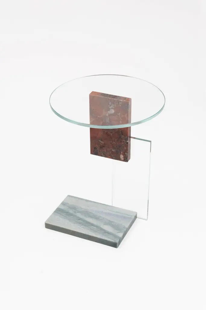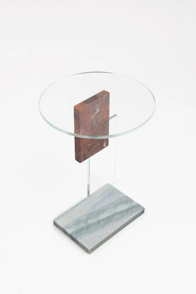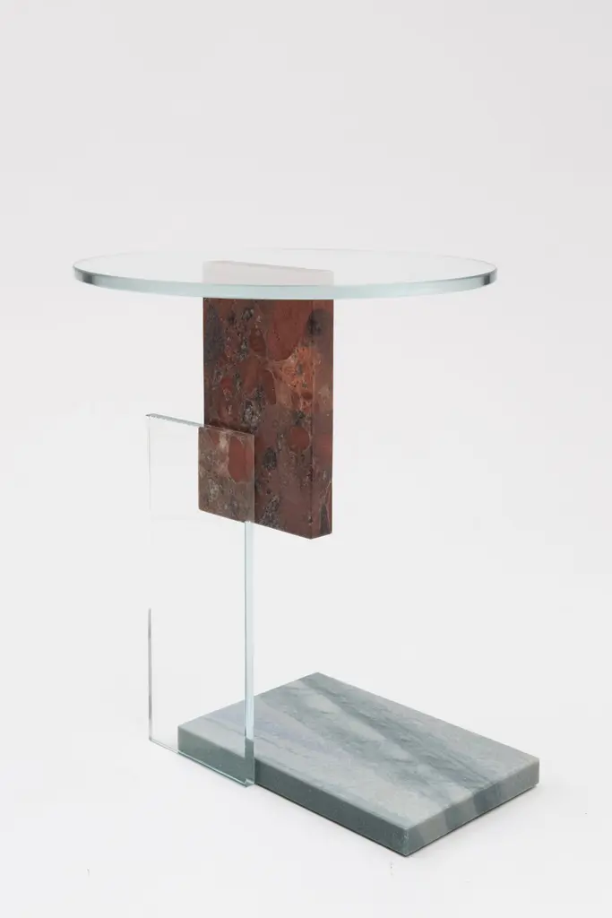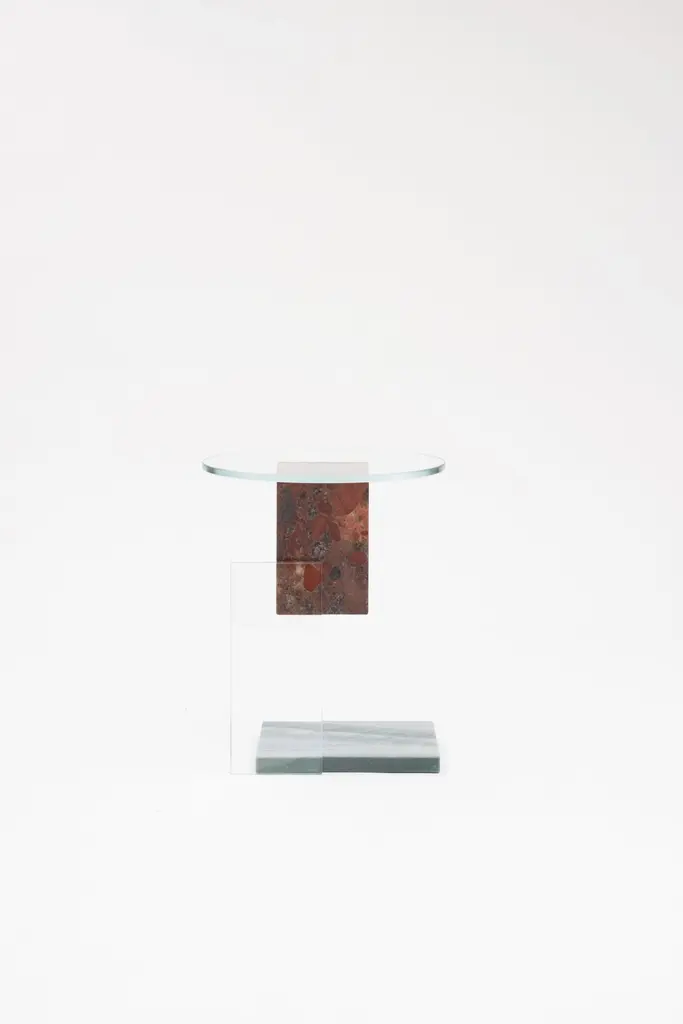 Delta S side table by Frederic SaulouLimited Edition of 10Materials: White glass, Azur Imperial marble from Brésil, Marinagé Rouge marble from Brésil.Dimensions: D 40 x H 50 cmSigned and numbered."The first question that one could ask oneself in front of these works could be about the notion of balance or even volumetric understanding.Beyond the use, these two new pieces thus raise a technical and symbolic question announcing my creative reflection.Indeed, my work since 2013 tends to highlight the mineral materials from buildings and heritage to give them back their nobility, to question the territory around the material, know-how, in closeconnection with architecture and his history.For this new collection, I like to play on the dualities offered by the different properties of the materials used and their architectural uses, reflected in the tension and technicality betweenthe colored, dense and heavy stone in balance with the transparent glass, thin and light."Frederic Saulou's sculpted design artworks introduce a series of work coming from researches andpartnerships between local ateliers and designer, and implemented to another scale: That of the object and contemporary creation.Frédéric Saulou is a proeminent French contemporary designer.Born in 1989, Frédéric Saulou, lives and works in Rennes, in France. Graduated in space and environmental design at the Institut Supérieur des Arts Appliqués (LISAA) in 2011 and in object design at the Ecole Européenne Supérieure des Beaux Arts de Rennes (EESAB) in 2013, Frédéric will continue to perfect his experience within the Eric Gizard Associés agency and with the designer Frédéric Ruyant. In 2013, he founded the studio, Frédéric Saulou Design Studio, an independent and multidisciplinary design and consulting agency that sees design as a space for research and exchange that allows him to develop a sensitive approach to forms and materials.Experimentation and research take precedence over his work in order to think of new materials and new uses. This accompanies his daily approach so that each project is conceived as a sculpture in its own right, between simplicity and technicality. His approach guides him towards a global approach but also unique in his creations, thus creating particular interactions between the user and the object, between Industrial craftsmanship. Today Frédéric works on various projects, from objects to space, in series or limited editions and collaborates with prestigious institutions and brands such as the publishing houses Ligne Roset, Drugeot Manufacture, Brossier Saderne, Vista Alegre, Esprit Porcelaine Limoges etc.