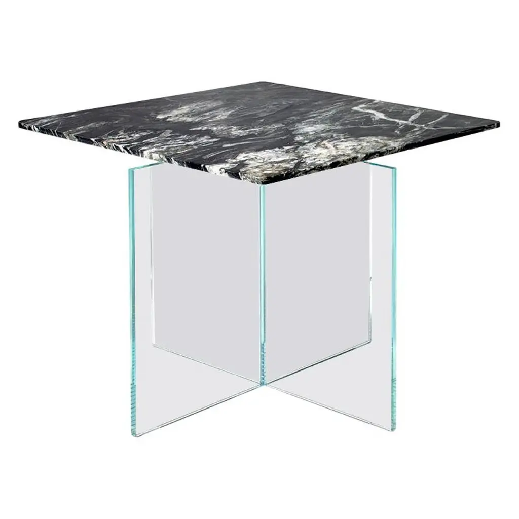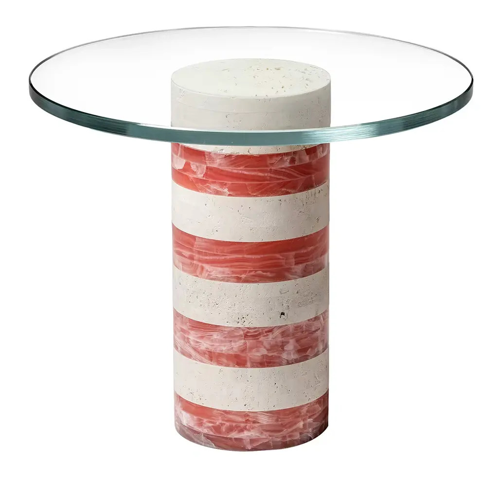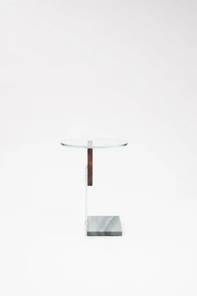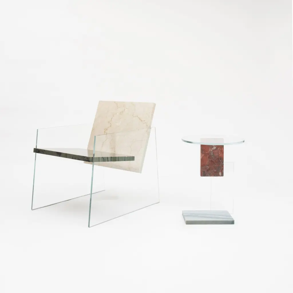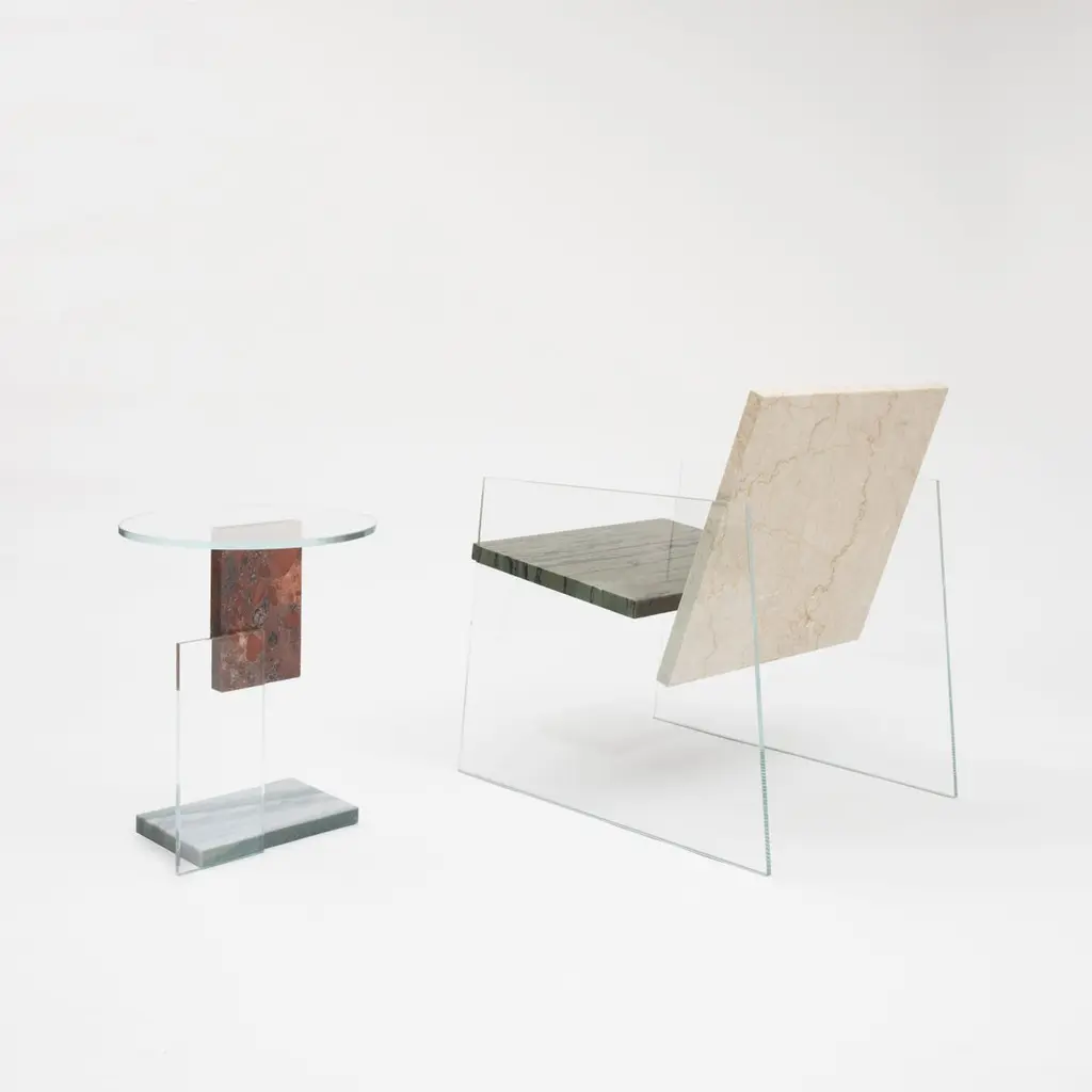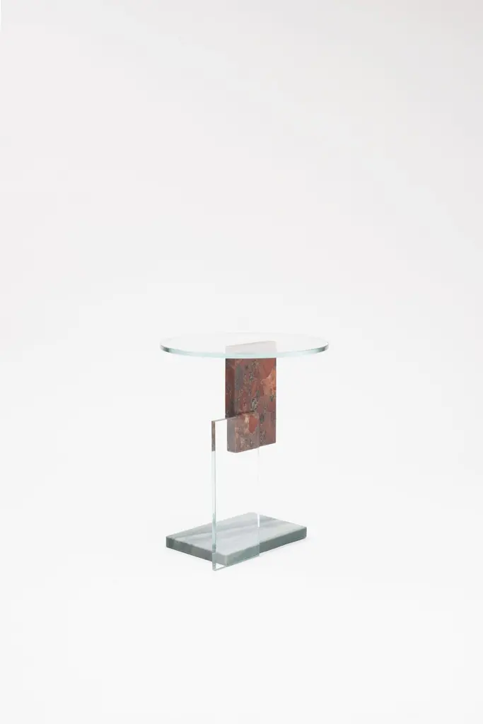 Delta S side table by Frederic SaulouLimited Edition of 10Materials: White glass, Azur Imperial marble from Brésil, Marinagé Rouge marble from Brésil.Dimensions: D 40 x H 50 cmSigned and numbered."The first question that one could ask oneself in front of these works could be about the notion of balance or even volumetric understanding.Beyond the use, these two new pieces thus raise a technical and symbolic question announcing my creative reflection.Indeed, my work since 2013 tends to highlight the mineral materials from buildings and heritage to give them back their nobility, to question the territory around the material, know-how, in closeconnection with architecture and his history.For this new collection, I like to play on the dualities offered by the different properties of the materials used and their architectural uses, reflected in the tension and technicality betweenthe colored, dense and heavy stone in balance with the transparent glass, thin and light."Frederic Saulou's sculpted design artworks introduce a series of work coming from researches andpartnerships between local ateliers and designer, and implemented to another scale: That of the object and contemporary creation.Frédéric Saulou is a proeminent French contemporary designer.Born in 1989, Frédéric Saulou, lives and works in Rennes, in France. Graduated in space and environmental design at the Institut Supérieur des Arts Appliqués (LISAA) in 2011 and in object design at the Ecole Européenne Supérieure des Beaux Arts de Rennes (EESAB) in 2013, Frédéric will continue to perfect his experience within the Eric Gizard Associés agency and with the designer Frédéric Ruyant. In 2013, he founded the studio, Frédéric Saulou Design Studio, an independent and multidisciplinary design and consulting agency that sees design as a space for research and exchange that allows him to develop a sensitive approach to forms and materials.Experimentation and research take precedence over his work in order to think of new materials and new uses. This accompanies his daily approach so that each project is conceived as a sculpture in its own right, between simplicity and technicality. His approach guides him towards a global approach but also unique in his creations, thus creating particular interactions between the user and the object, between Industrial craftsmanship. Today Frédéric works on various projects, from objects to space, in series or limited editions and collaborates with prestigious institutions and brands such as the publishing houses Ligne Roset, Drugeot Manufacture, Brossier Saderne, Vista Alegre, Esprit Porcelaine Limoges etc.
