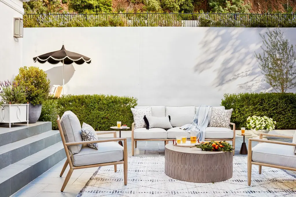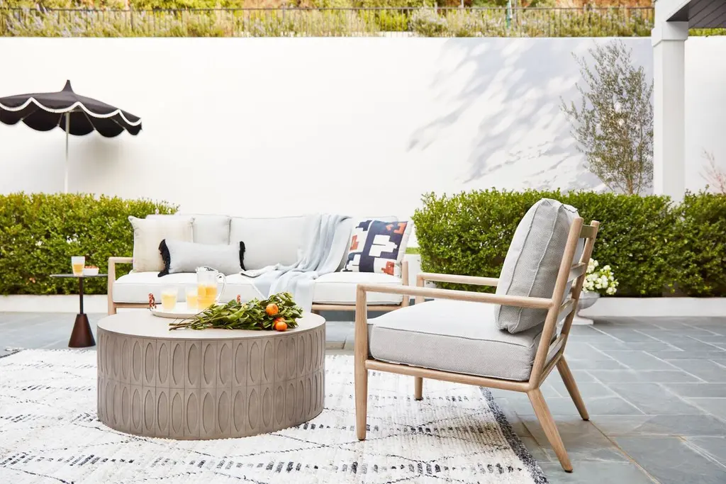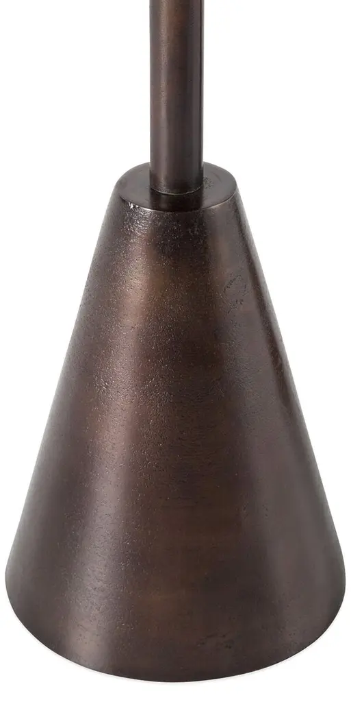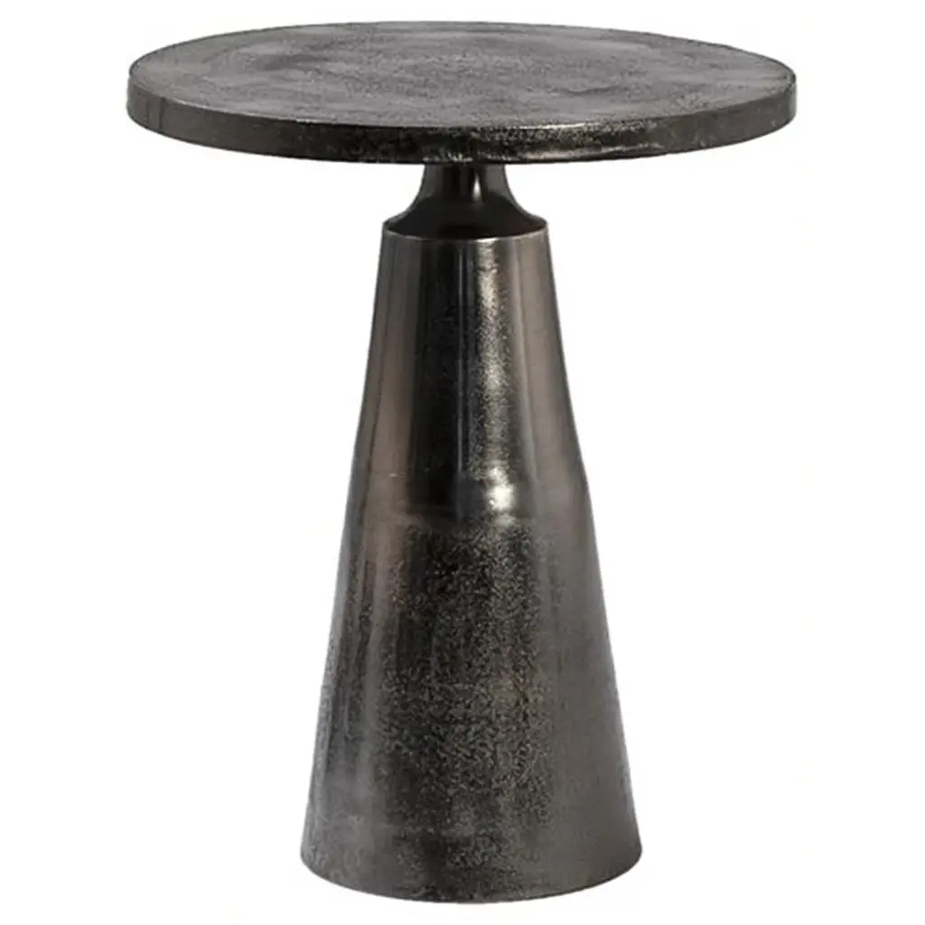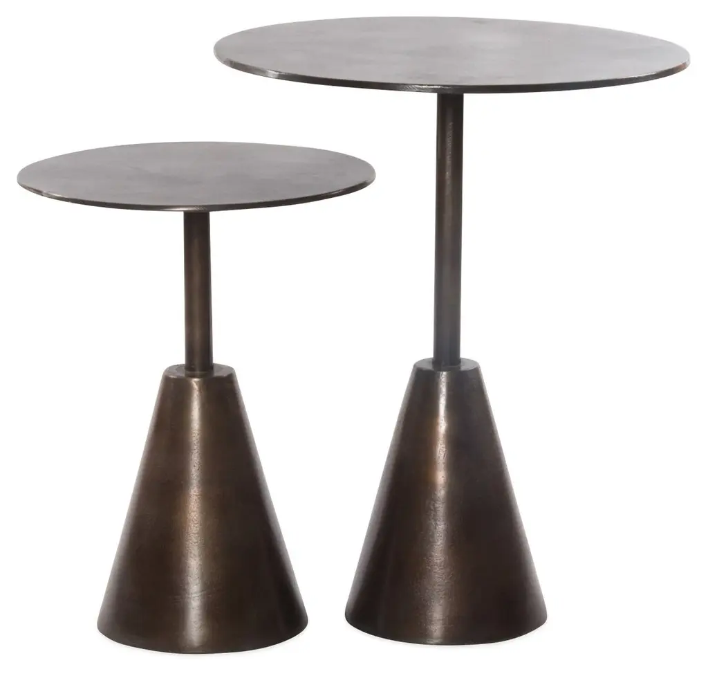 A stylish and practical addition to the porch, patio, or deck, these contemporary side tables are each crafted of aluminum with a round top, cone base, and antiqued rust finish.
