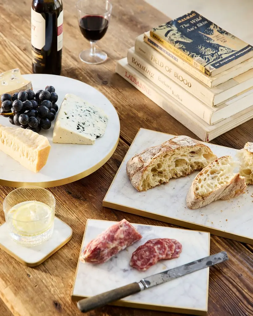 As fair as its namesake city, the Verona Collection of marble tabletop accessories is an elegant addition to any kitchen. The glamorous marble is trimmed in soft gold bands and gentle scallops, making these pieces both glamorous and timeless. Set of 4. 4"L x 4"W. Made in India. Hand wash with mild soap.