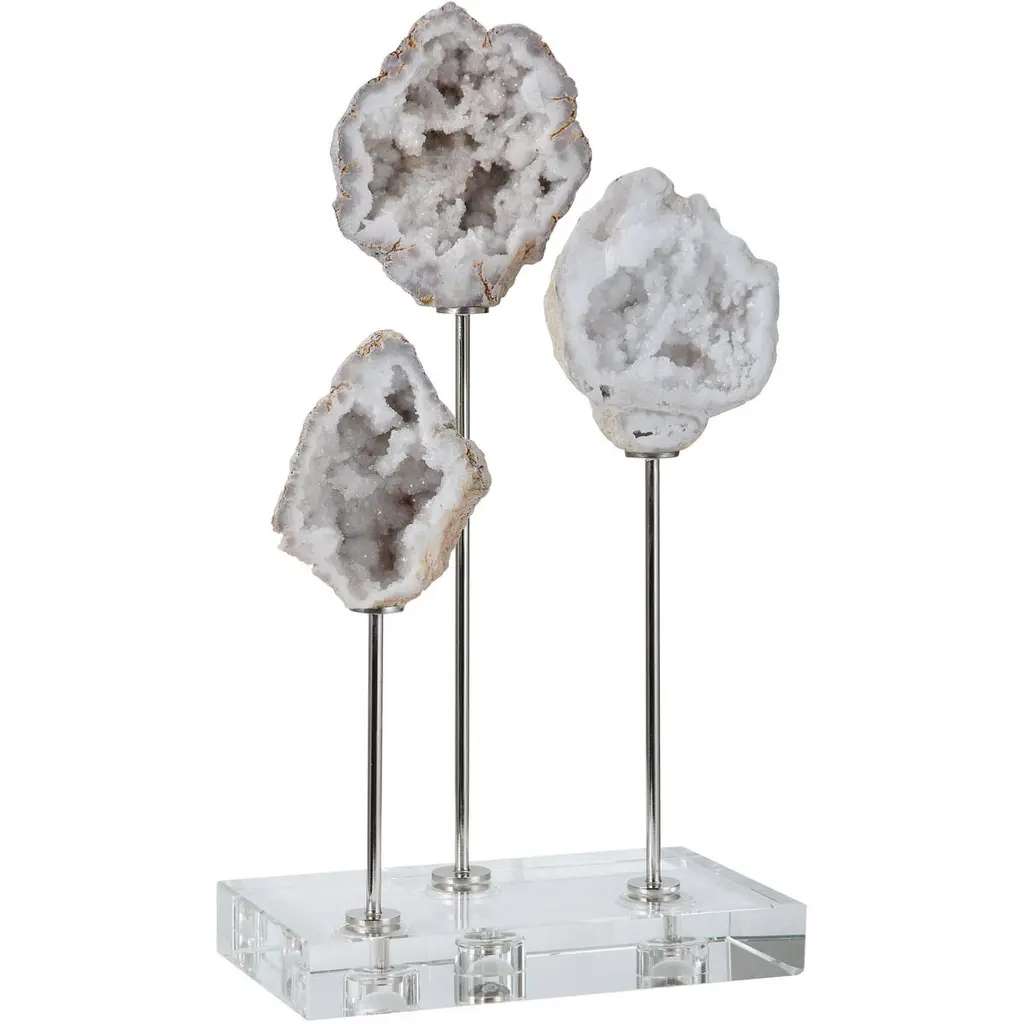Whether accenting your vanity or anchoring the entryway console table, this distinctive decor is sure to draw the eye. It features a slice of stone agate sitting at the center. For added interest, this piece sits atop a cube of white marble and has gold leafing for a glamourous touch.