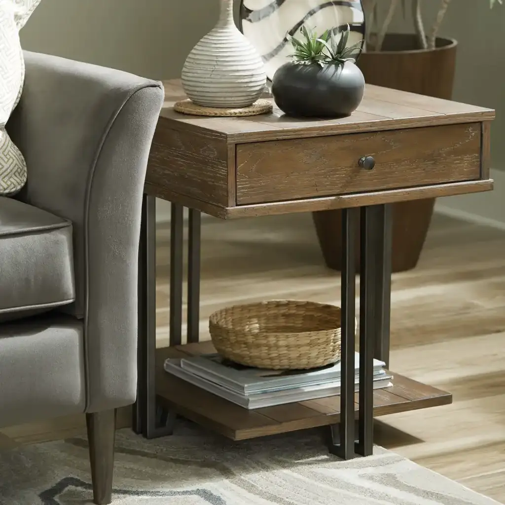 The Rectangular Drawer End Table from Saddletree-Hamilton seamlessly blends durability with modern design. Crafted from oak veneers, it showcases a rich wood grain that adds warmth to any space, while sturdy metal legs provide an industrial touch. A spacious drawer offers discreet storage for everyday essentials, and the lower shelf enhances organization and display options. Thoughtfully designed for both function and style, this versatile end table complements a range of interiors, making it a practical and elegant addition to any living space.