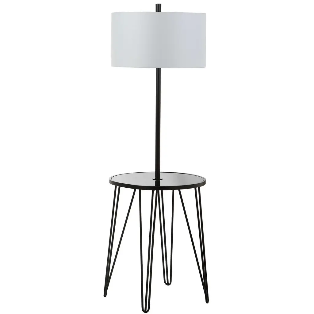 Instantly update any living room with this contemporary floor lamp side table. Inspired by mid-century American designers, its black metal hairpin legs add vintage style while its table is an ideal surface for handling life's accoutrements in a snap. Bulb Wattage: 13W Number of Lights: 1 Light Lamp Type: Floor Lamp Material: Metal, Glass Lighting Style: Contemporary Color: Black, Off-White