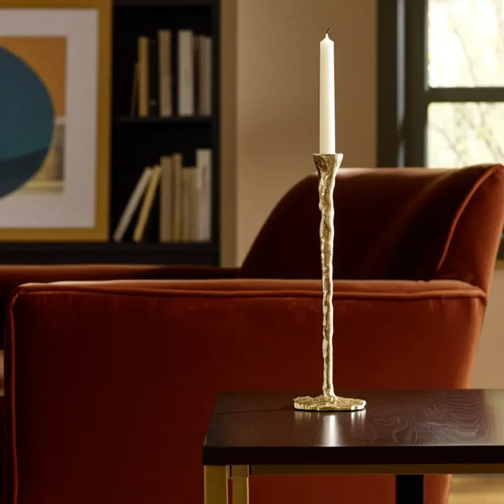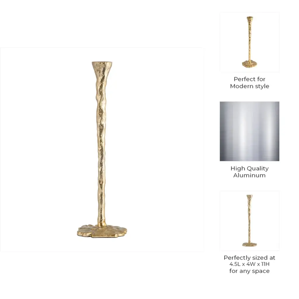 Create a stunning, glamorous look at your home, office or special event. Whether you want to display your elegant taste at all times or just on special occasions, this high quality metal candle holder is just what you need! Crafted out of aluminum, this uniquely designed forged candle holder comes in a beautiful metallic gold color. Add your favorite taper candle and light up your space, using it as an impressive table centerpiece or as a decorative accent for any mantle, shelf or side table.