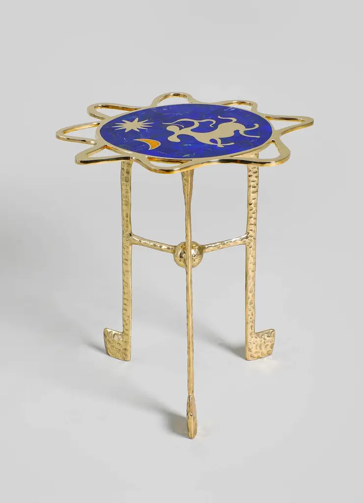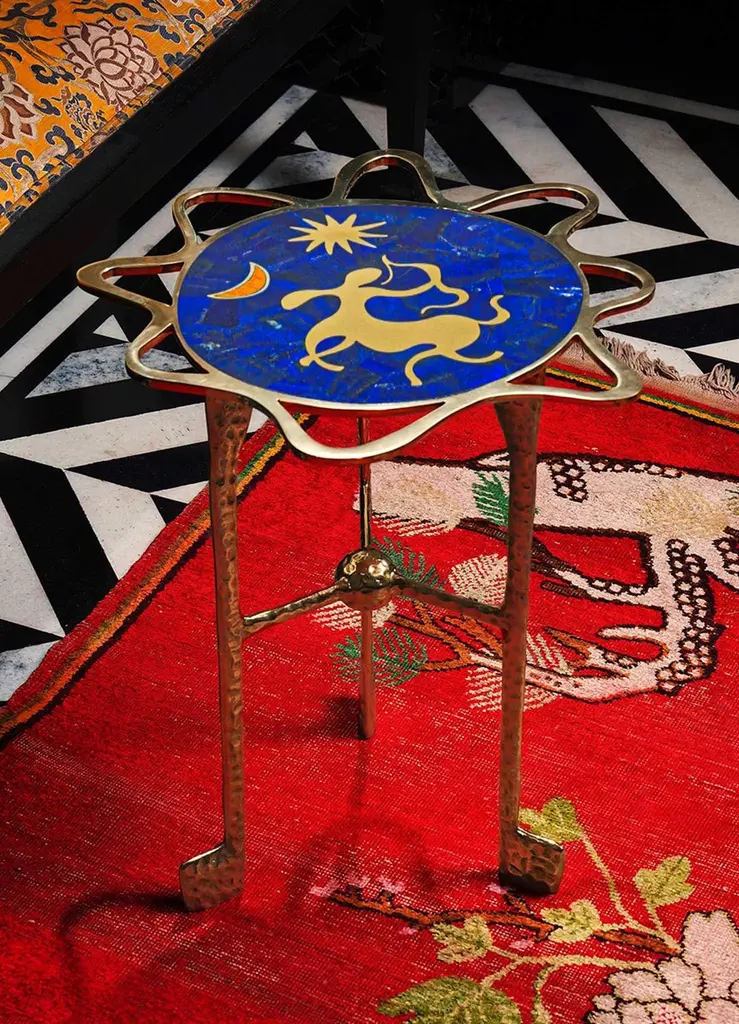 Bring the universe home, and see what’s written in the stars. These renderings of enamel and brass depict the ineffable mysticism of planetary movements, one which governs and dictates the lives of millions across India. Each meticulously designed object features a stone corresponding to its zodiac sign, reflecting the deep fascination held for the cosmic energies influencing destinies. These pieces serve as a tangible link to the celestial forces and elicit the true nature within us all.Side Table in brass with semi precious inserts. Handmade in India.Product DetailsMaterial: BrassInlay: Lapiz Lazuli , Camel JasperSize: 17.5"L x 16.5"W x 20"H 44.5 L x 41.9 W x 50.8 H cmWeight: 9.5 kg 20.9 lbsNumber of Pieces: 1 Side TableSKU: VST571This product has been handcrafted by local artisans. As such, slight variations are a testament to the unique character of a piece made by hand.