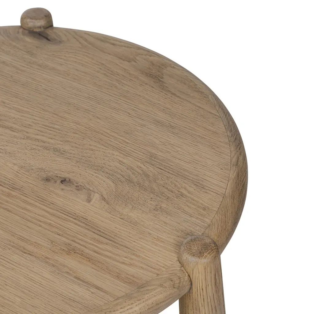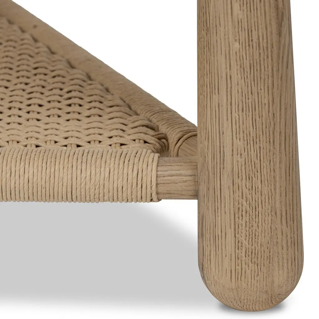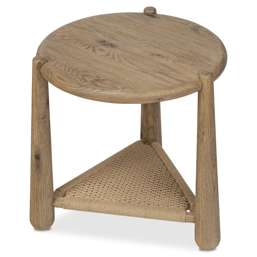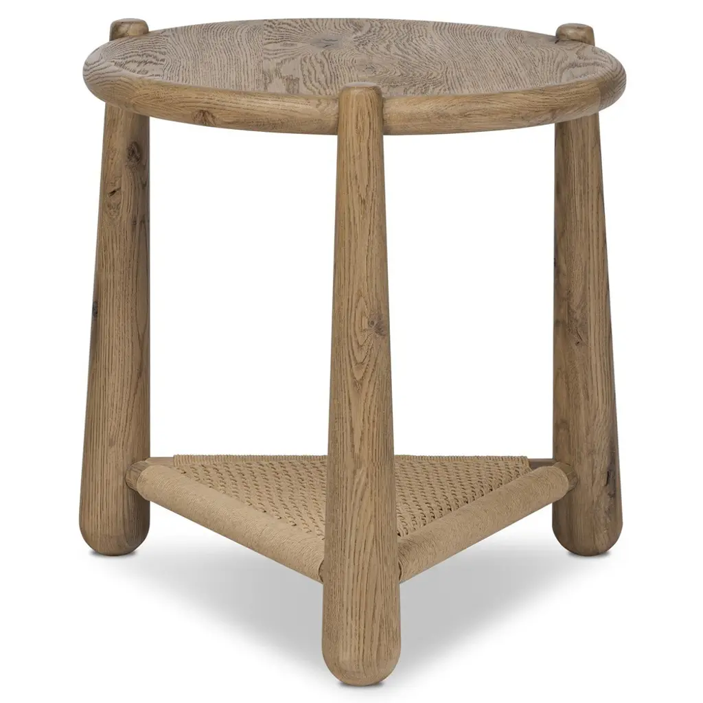 A design collaboration by Amber Lewis and Four Hands. Mix materials for intrigue. A rounded, two-tier end table is made from resawn oak with an aged, smoked finish, with heavy graining and natural knots. A lower shelf of woven paper cord brings texture — and storage — into play. Perfectly sized to keep your favorite drink or book within reach.