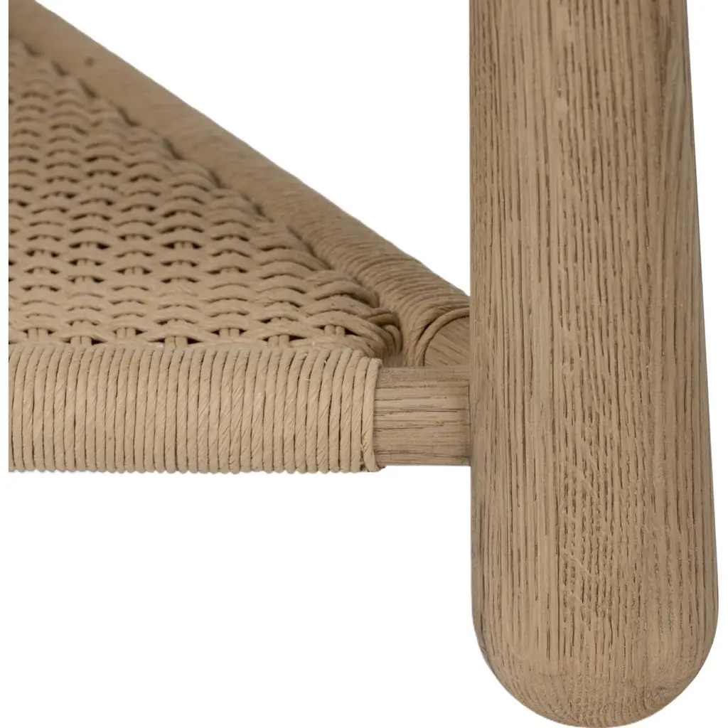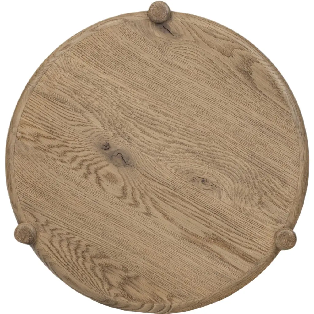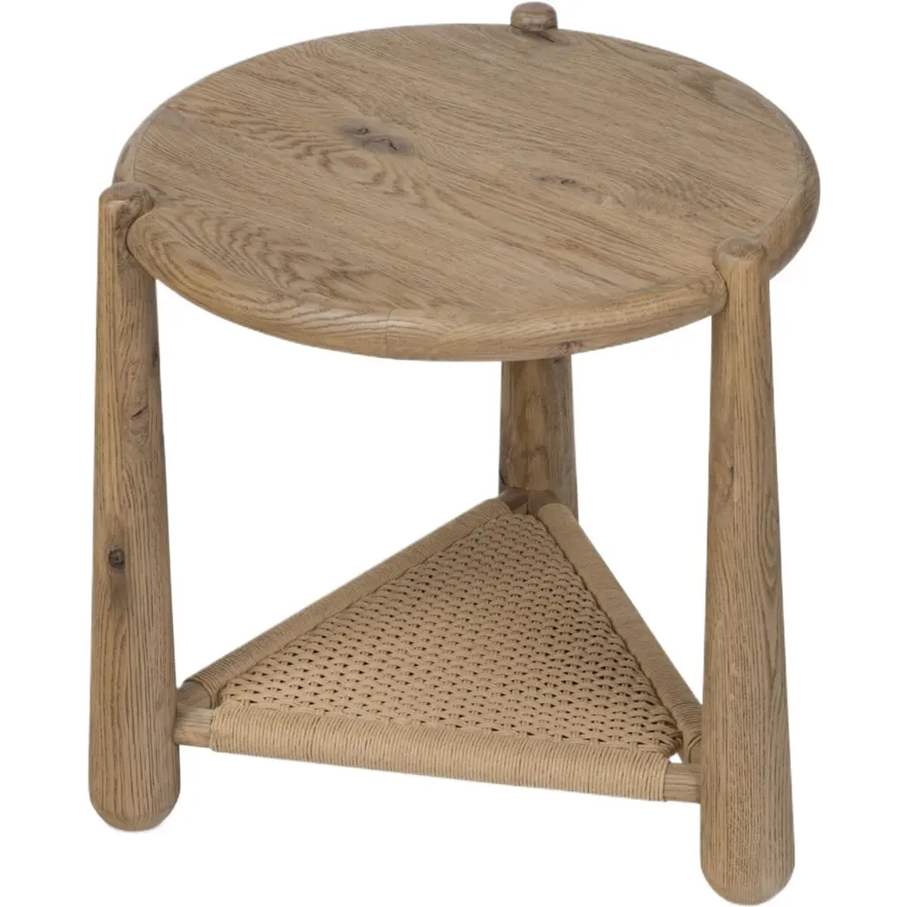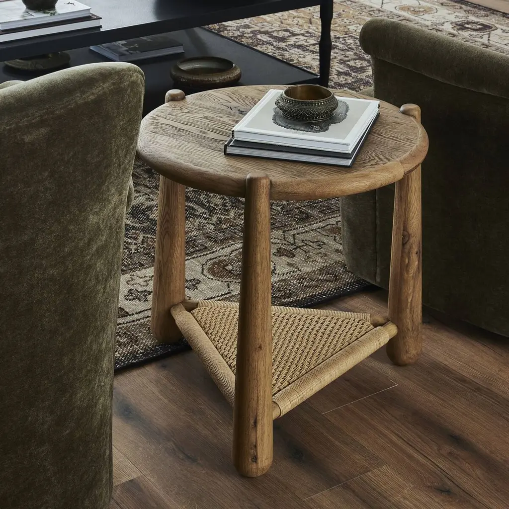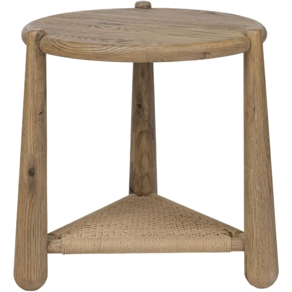 Mix materials for intrigue with this rounded, two-tier end table. Crafted with attention to detail, it features a top tier showcasing heavy graining and natural knots, while a lower shelf of woven paper cord adds texture and storage. Perfectly sized to keep your favorite drink or book within reach, this piece is a result of a design collaboration by Amber Lewis and Four Hands.