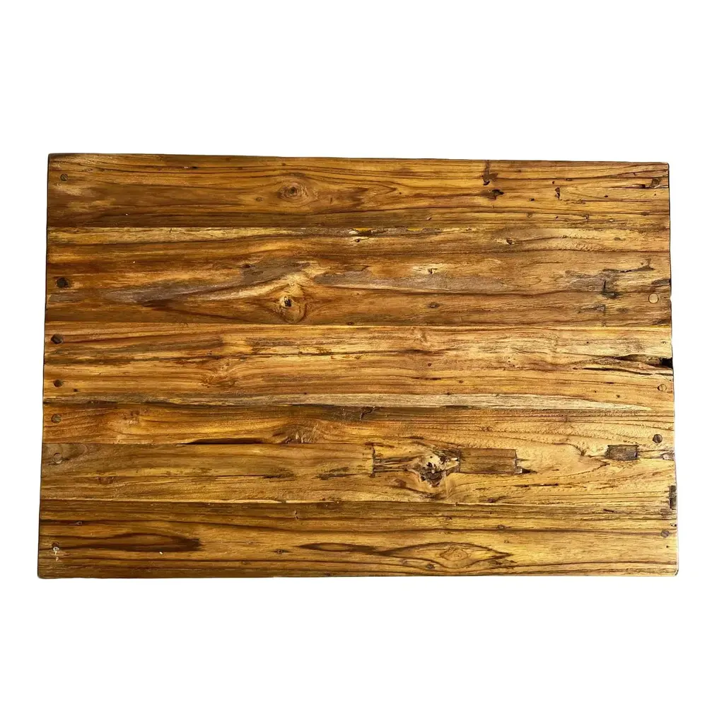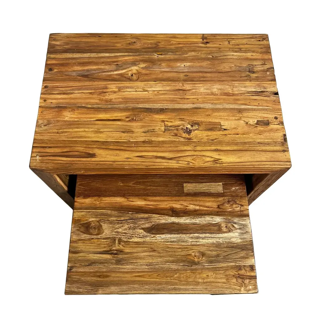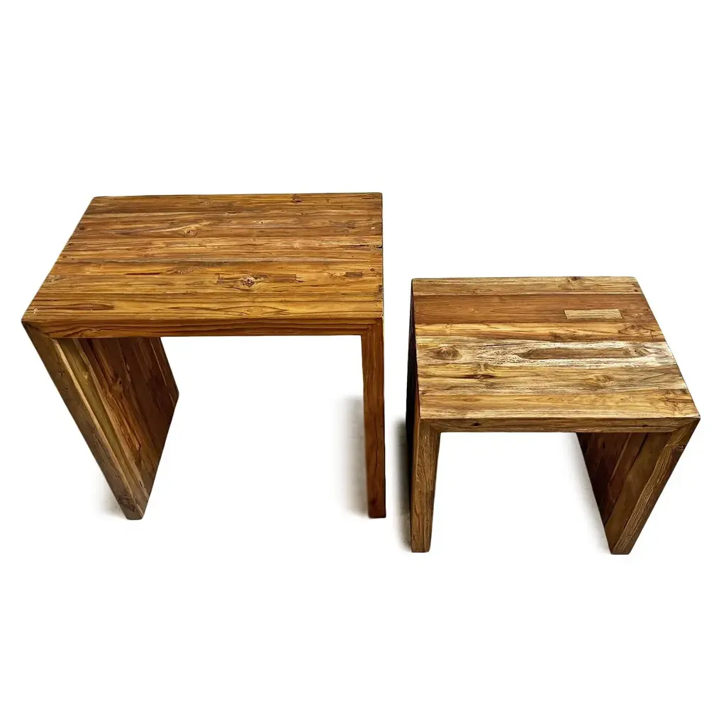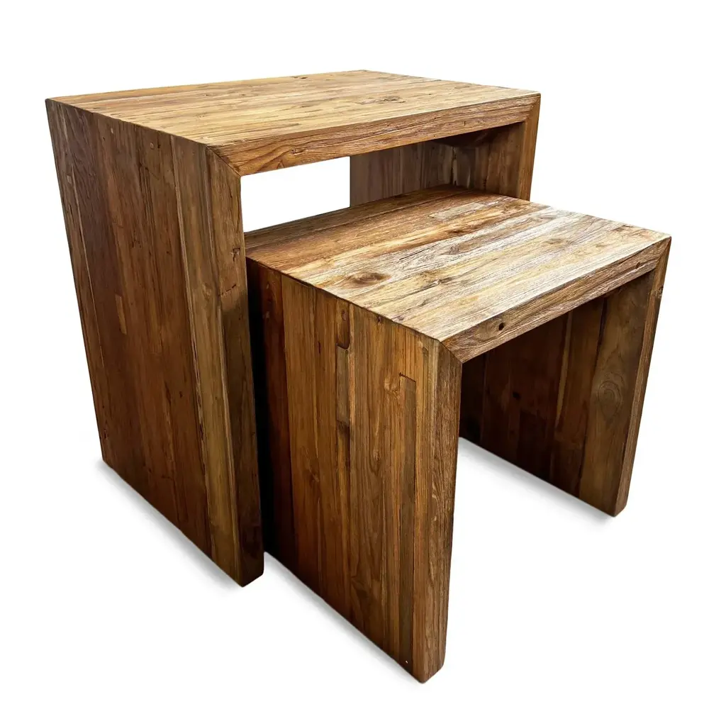 Set of two modern salvaged teak wood nesting side tables. Attractive medium brown finish which highlights the natural grain. Wonderful for many uses and spaces. Each will have variations in natural wood tones, grain, and imperfections inherent to the salvaged material. Smaller table measures 19"L x 16"D x 18"H. Sold as a set of two tables. Tables weigh approx. 50 lbs together.