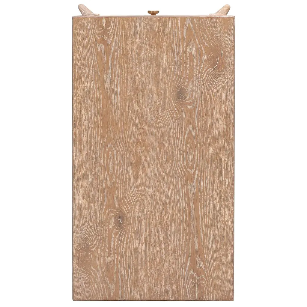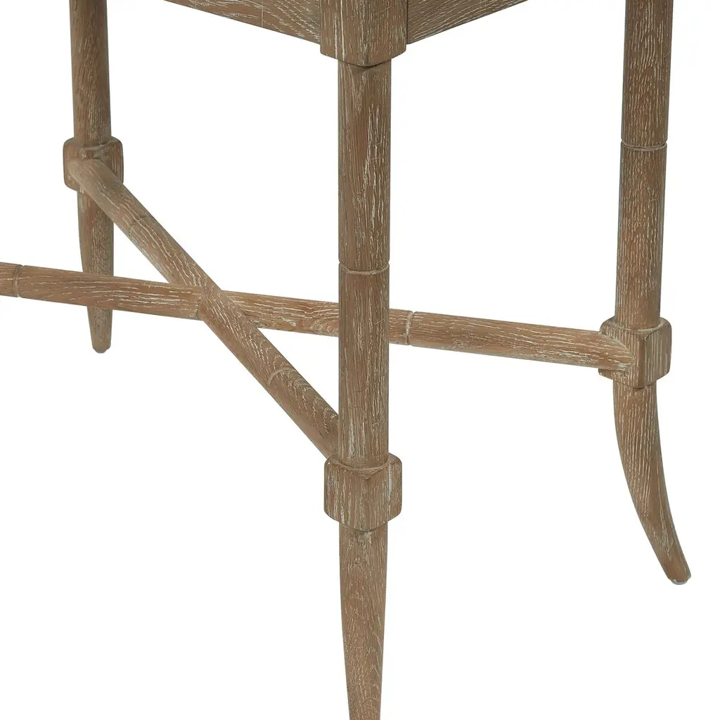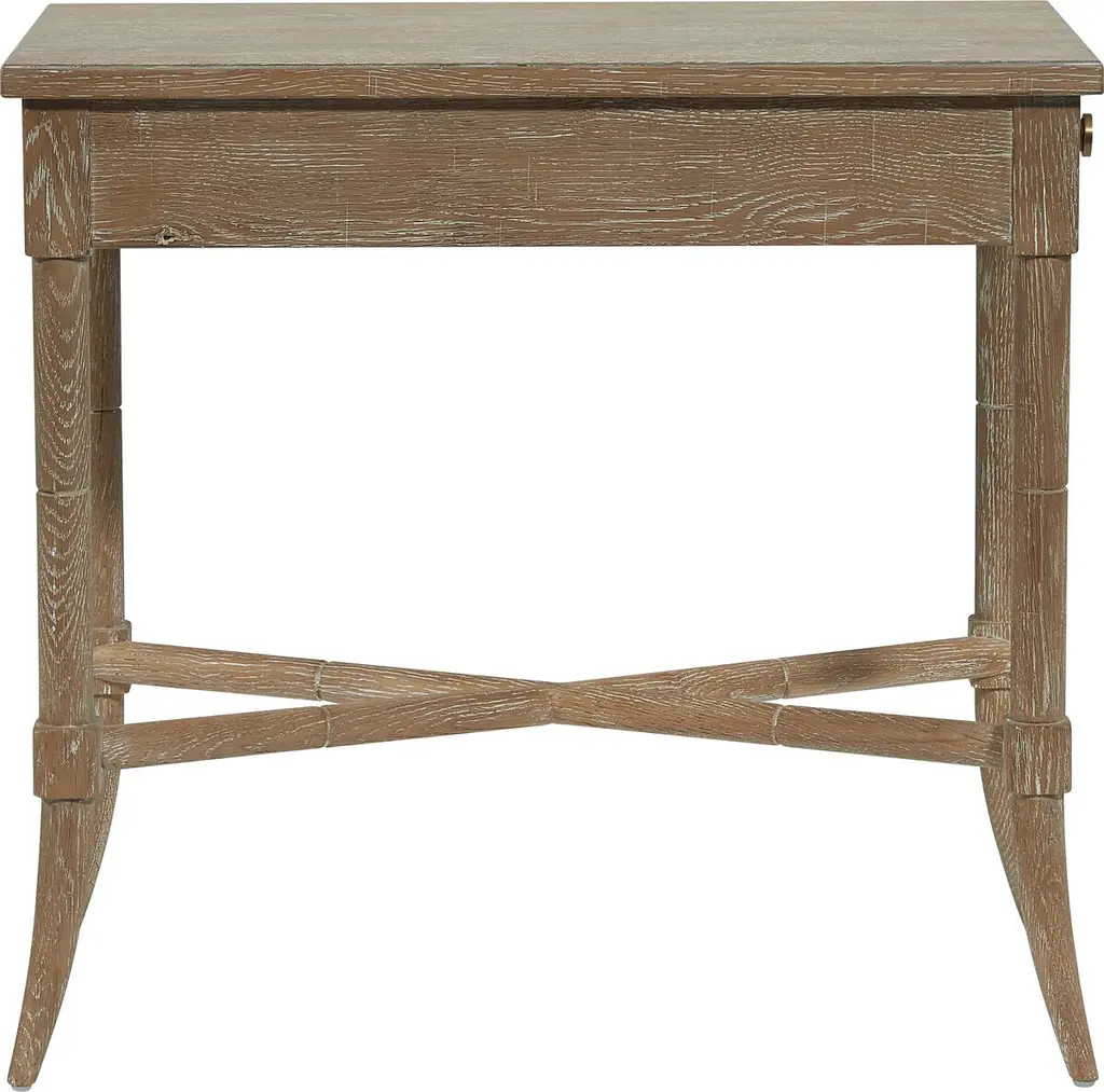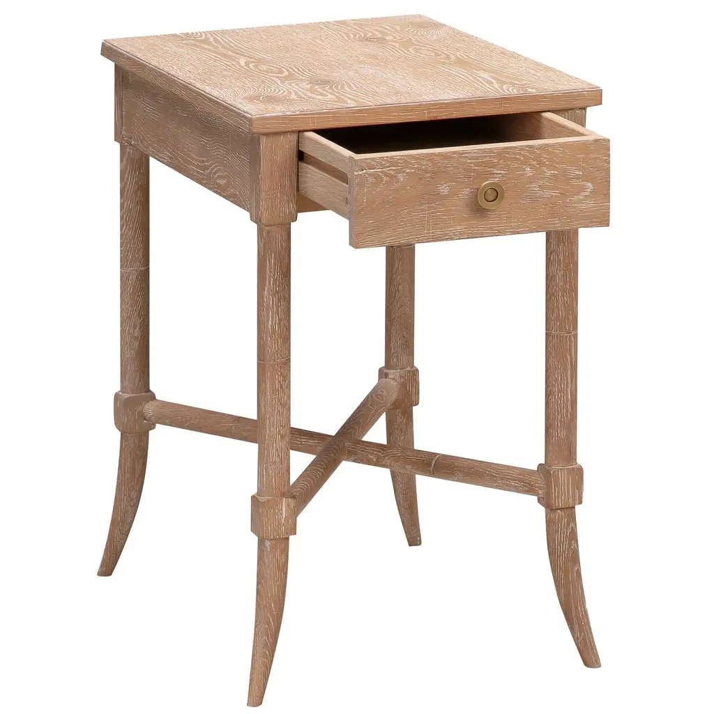 English Regency style inspired this one-drawer table's sabre legs and turned stretchers. The table is crafted of durable, scratch-resistant oak, and the limewash finish accentuates its eye-catching grain.