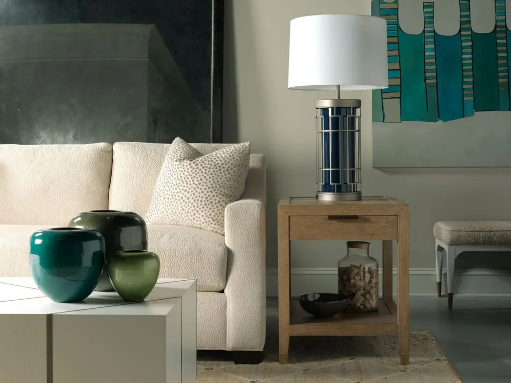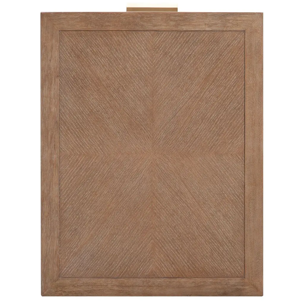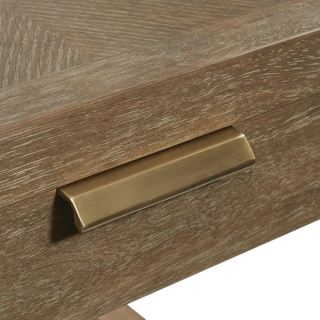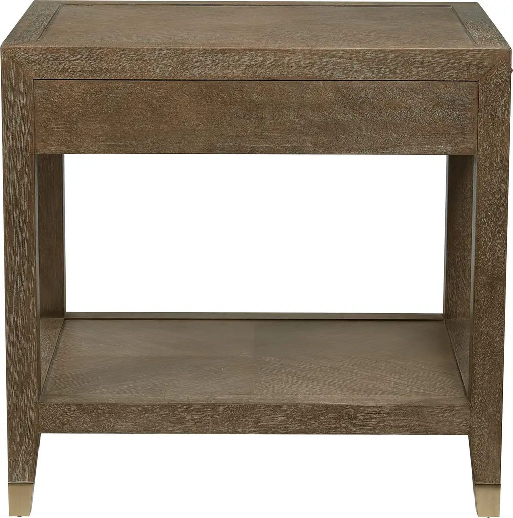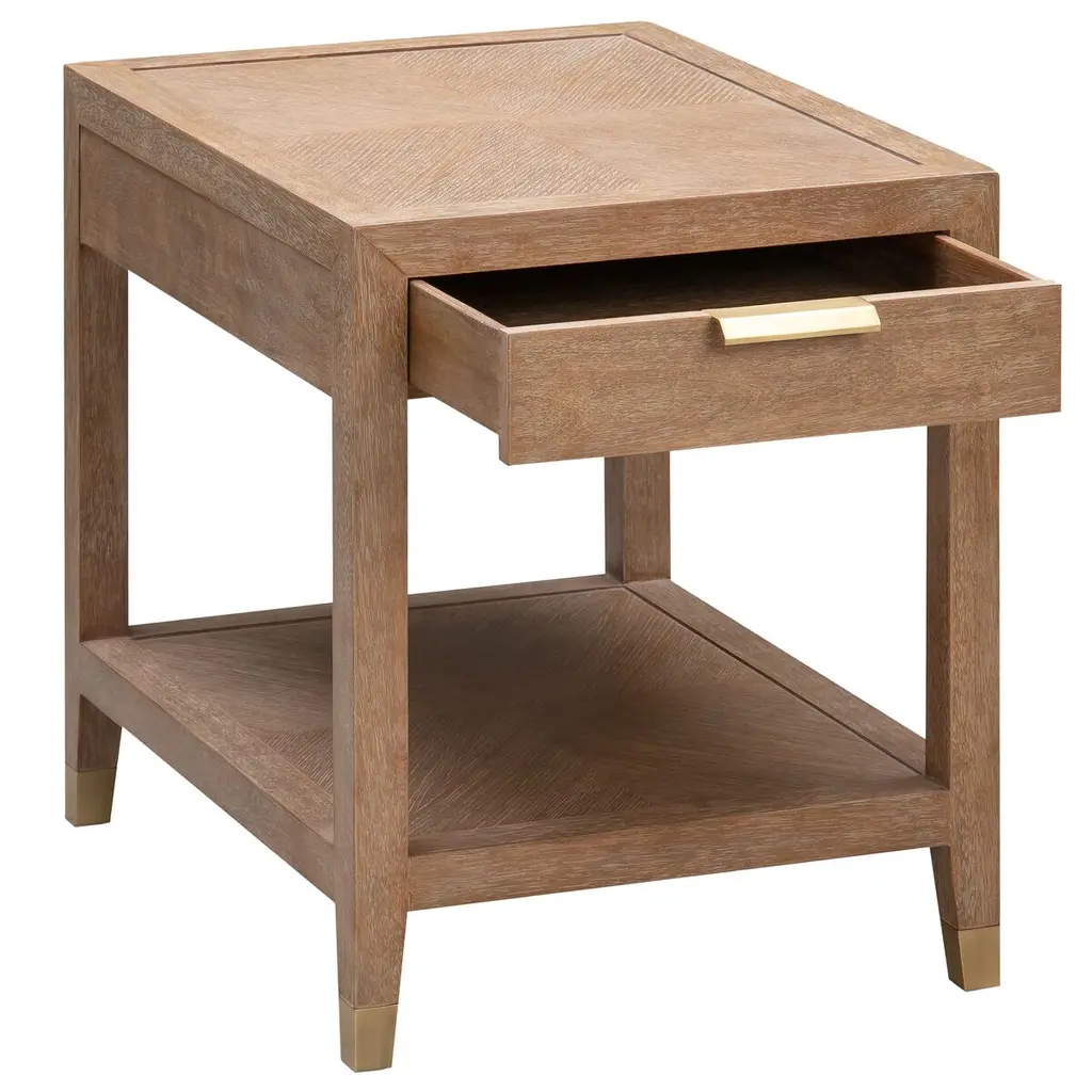 The clean lines of this one-drawer side table make it a welcome addition to just about any room. The brass ferrules and drawer pull complement the striking grain of the quarter-sawn oak veneers. The lower shelf provides added storage or display space.